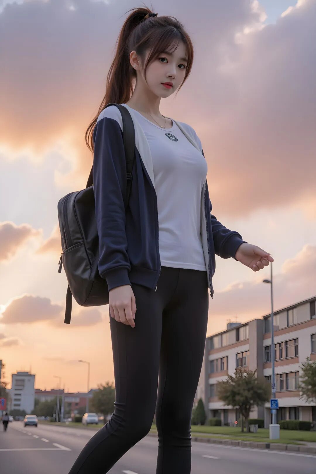 都市时尚少女,轻盈漫步街头,手机相伴,时尚穿搭