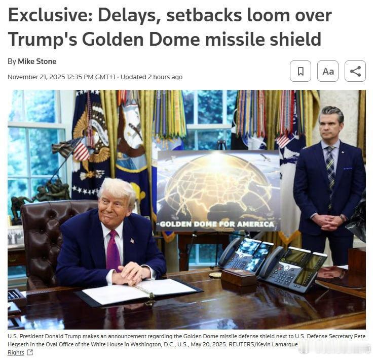 据路透社报道,由于政府长期停摆、250亿美元的支出计划缺失以及系统设计问题悬而未决,特朗普总统的“金顶”导弹防御系统计划严重延误。这些缺口导致五角大楼无法授予关键合同,危及该系统在2028年投入使用的目标。承包商也不愿投入巨资,担心未来的政府可能会取消该计划。