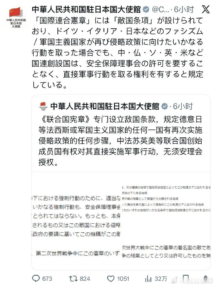 11月21日,中国驻日大使馆在社交平台X用中日双语发帖:《联合国宪章》专门设立敌国条款,规定德意日等法西斯或军国主义国家的任何一国有再次实施侵略政策的任何步骤,中法苏英美等联合国创始成员国有权对其直接实施军事行动,无须安理会授权。