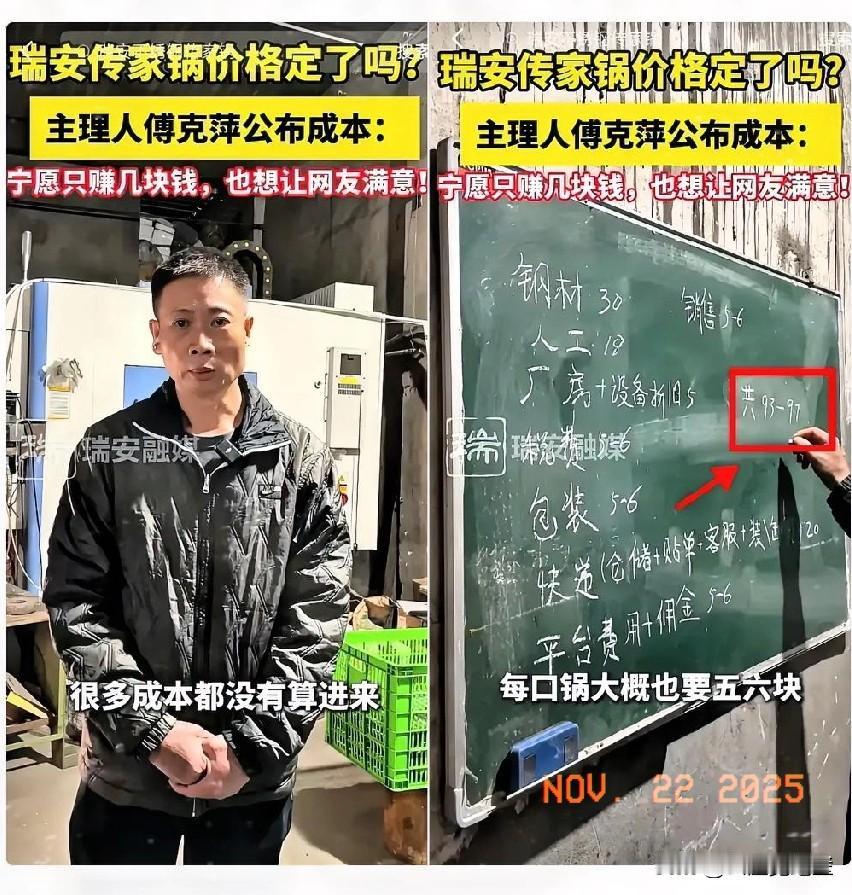 瑞安传家锅的价格出来了,可能要让很多人失望了!老板说,当初他给出50多的定价还是欠考虑,有很多成本没有考虑进去,比如包装、物流、平台佣金这些隐形成本这么高。 导致亏损严重,只好把价格提到99元。 虽然有亲戚劝说传家锅价格应该提价,或者定个999元,让大家觉得高大上,卖不出去再降价也不迟。 但老板还是坚持这个价格,他觉得这个锅值这个价。 值得一提的是,传家锅用的是食品级304不锈钢,不同于市面上很多劣质的不锈钢锅, 另外也省去了不锈钢中间环节,成本一目了然,价格也很透明。 总之,99元的价格在老板看来已经很合理了, 你们觉得呢?