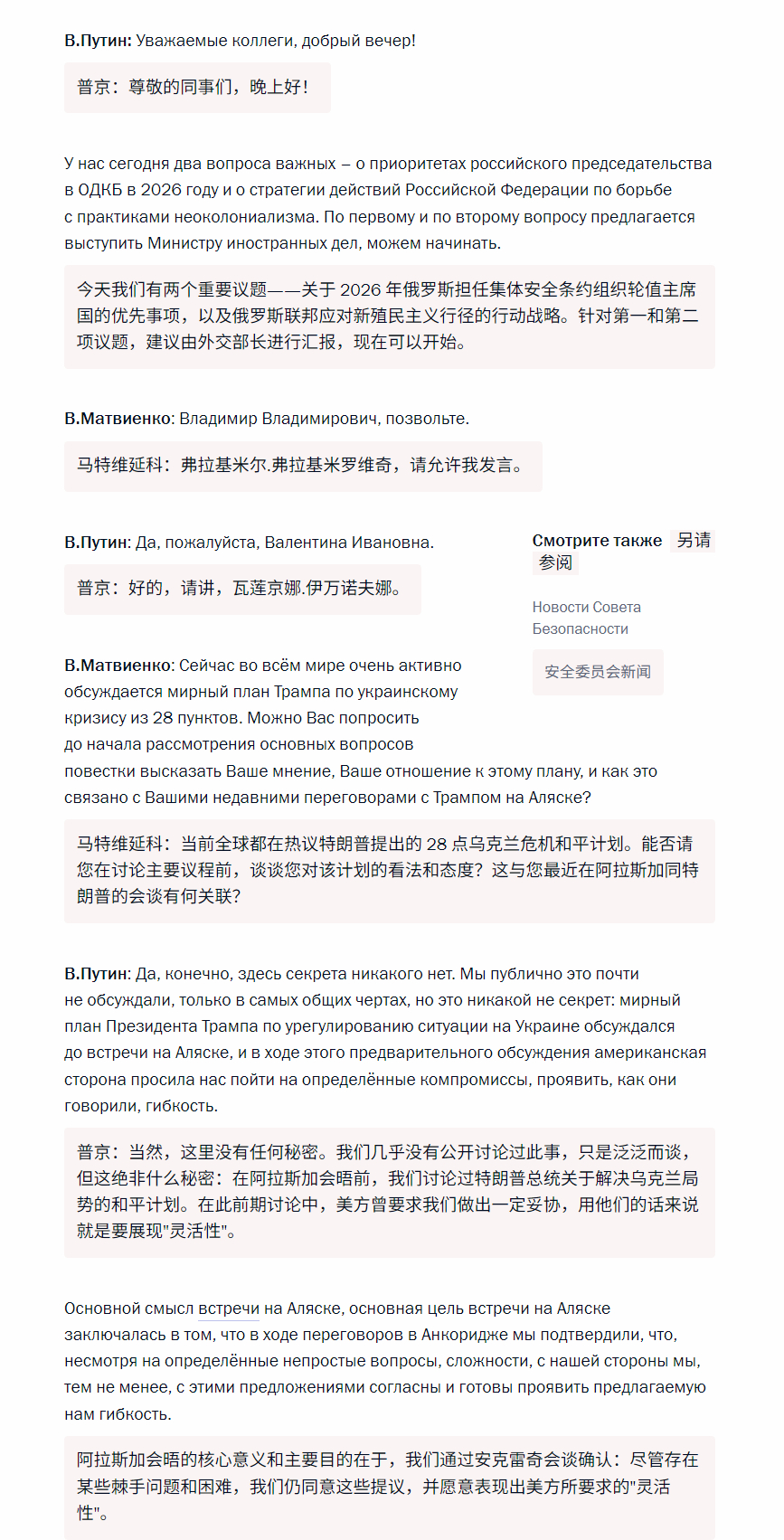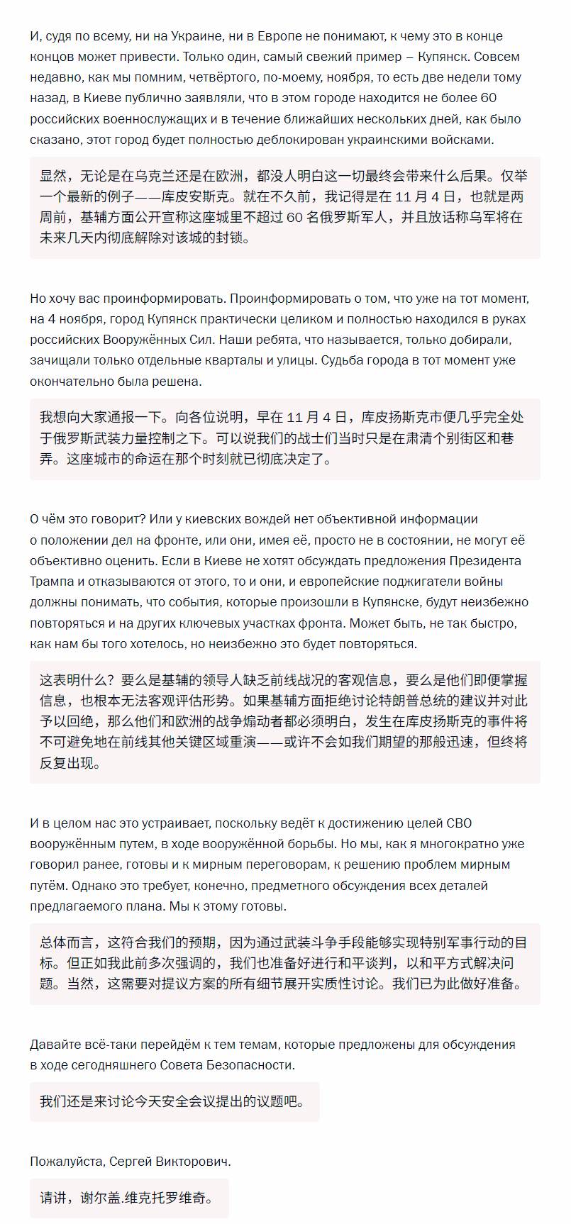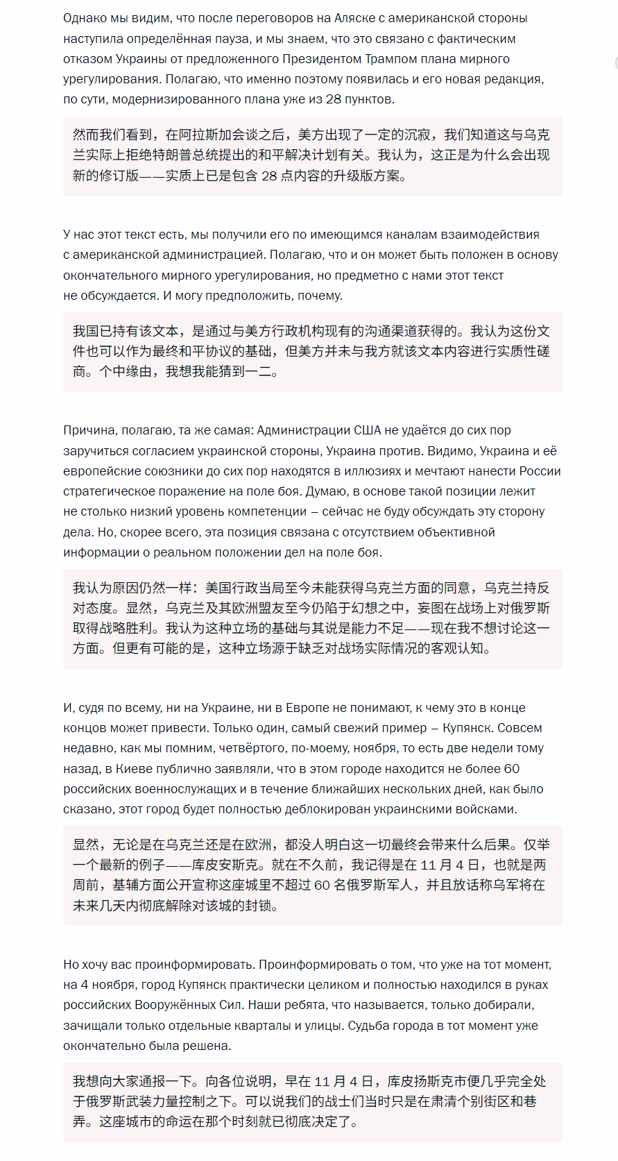 🔻普京:“当然,这里没有任何秘密。我们几乎没有公开讨论过此事,只是泛泛而谈,但这绝非什么秘密:在阿拉斯加会晤前,我们讨论过特朗普总统关于解决乌克兰局势的和平计划。在此前期讨论中,美方曾要求我们做出一定妥协,用他们的话来说就是要展现‘灵活性’。”🔻“我国已持有该文本,是通过与美方行政机构现有的沟通渠道获得的。我认为这份文件也可以作为最终和平协议的基础,但美方并未与我方就该文本内容进行实质性磋商。个中缘由,我想我能猜到一二。”🔻“我认为原因仍然一样:美国行政当局至今未能获得乌克兰方面的同意,乌克兰持反对态度。显然,乌克兰及其欧洲盟友至今仍陷于幻想之中,妄图在战场上对俄罗斯取得战略胜利。我认为这种立场的基础与其说是能力不足——现在我不想讨论这一方面。但更有可能的是,这种立场源于缺乏对战场实际情况的客观认知。”🔻“显然,无论是在乌克兰还是在欧洲,都没人明白这一切最终会带来什么后果。仅举一个最新的例子——库皮安斯克。就在不久前,我记得是在 11 月 4 日,也就是两周前,基辅方面公开宣称这座城里不超过 60 名俄罗斯军人,并且放话称乌军将在未来几天内彻底解除对该城的封锁。”🔻“我想向大家通报一下。向各位说明,早在 11 月 4 日,库皮扬斯克市便几乎完全处于俄罗斯武装力量控制之下。可以说我们的战士们当时只是在肃清个别街区和巷弄。这座城市的命运在那个时刻就已彻底决定了。”🔻“这表明什么?要么是基辅的领导人缺乏前线战况的客观信息,要么是他们即便掌握信息,也根本无法客观评估形势。如果基辅方面拒绝讨论特朗普总统的建议并对此予以回绝,那么他们和欧洲的战争煽动者都必须明白,发生在库皮扬斯克的事件将不可避免地在前线其他关键区域重演——或许不会如我们期望的那般迅速,但终将反复出现。”🔻“总体而言,这符合我们的预期,因为通过武装斗争手段能够实现特别军事行动的目标。但正如我此前多次强调的,我们也准备好进行和平谈判,以和平方式解决问题。当然,这需要对提议方案的所有细节展开实质性讨论。我们已为此做好准备。”🔻via 克宫官网