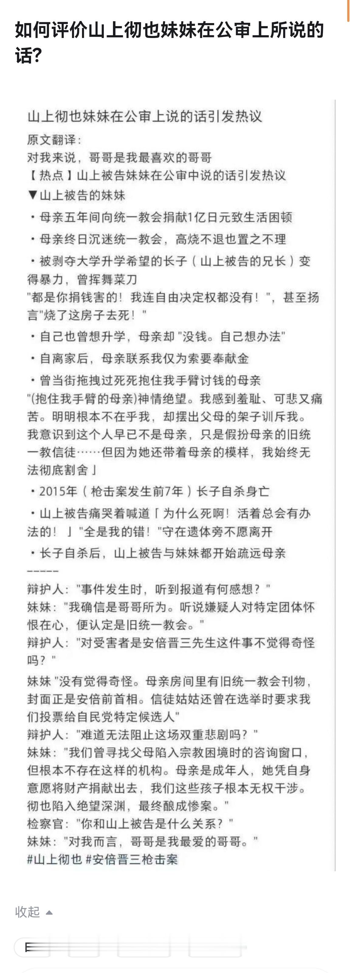 🔻检察官:“你和山上彻也是什么关系?”🔻妹妹:“哥哥一直是我最喜欢的哥哥。”🔻妹妹:“房间中有统一教会刊物,封面正是安倍前首相。信徒姑姑也让投票时投给特定自民党候选人。”🔻安倍桑,你死的不冤啊。