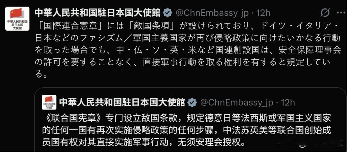 高市早苗在沉默十天后现身首相官邸,她的表态看似“不变”,实则暗藏玄机。 她重申推进“中日战略互惠关系”,是想给紧张局势降温,稳住经济基本面。但更关键的是,她拒撤涉台言论,并搬出“存亡危机事态”这一模糊概念,这是在为未来可能的军事介入留后门,迎合国内右翼势力。这种“既要…又要…”的投机策略,暴露了她及背后势力的真实意图:在安全上对华强硬,在经济上又想捞好处。 然而,中方这次连出两招,彻底看穿了她的把戏。外交部的驳斥是“堵路”,明确告诉日方,不纠正错误,一切免谈。而驻日使馆援引“敌国条款”,则是“掀桌”,是战略层面的严厉警告。日本政府几十年来一直试图推动删除这一条款,深知其象征的“战败国”地位是何等刺痛。中方在此刻提起,等于是在提醒日本:你的历史包袱还没卸下,别妄想挑战战后国际秩序的核心。 中方的反应已从“反对具体行为”升级为“警示根本立场”。高市等人的顽固,正在将日本推向极其危险的境地。中日关系的压舱石已被动摇,若日方再不醒悟,两国关系的“冰河期”将难以避免。