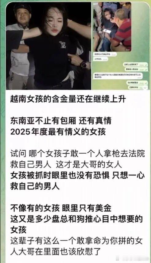 法场劫囚,现实版“英雄”片上演11月18日,柬埔寨一家法院的停车场内,上演了一场现实版的“劫法场”。一名女子伪装成家属混入其中,突然拔枪劫持了押解车队,成功救出6名越南籍囚犯。过程中,她甚至将枪递给一名囚犯,后者开枪袭击警员制造混乱,随后七人驾车逃亡。然而,天网恢恢,当日所有人在警方的追捕下再度落网。被捕时,场面令人动容:大哥哭喊着“放了我女朋友”,而女子则回头高呼:“豪哥,我不后悔!”这段充满戏剧性的监控视频和对话,迅速在网络上引爆关注。随着事件发酵,这位女子的背景被网友扒出。在往日的生活照中,她鹅蛋脸、大眼睛、长发及腰,日常穿着白T牛仔裤,清纯甜美的模样宛若明星,让人难以将她与持枪劫囚的悍匪形象联系起来。据悉,事情的起因是“大哥”落网前,给了她一块百达翡丽手表和一百万美元,让她远走高飞。然而,她毅然卖掉了名表,换来的不是安稳余生,而是一把枪,孤身奔赴了一场几乎不可能的营救。这种为爱豁出一切的决绝,让她被国外网友称为“东南亚第一深情”、“最后的大嫂”。这场充满江湖义气的举动,不仅点燃了网络,更惊动了暗网世界。据传,暗网上多位匿名大佬发出“捞人”任务,悬赏金额从20万美元一路攀升至600万美元,最终定格在511枚比特币(约合2900万美元)的天价。他们认为,在这个时代,“义字当头”的精神已近乎绝迹。有知情人士透露,已有雇佣兵组织受雇前往柬埔寨,试图策划“狸猫换太子”的行动。尽管此事沸沸扬扬,但金钱驱动的暗流能否撼动现实的法律铁壁,仍是未知数。尽管“大嫂”的故事被广泛传播,甚至被浪漫化解读,但我们必须清醒地认识到:她与所劫团伙涉嫌毒品、电诈、非法持枪等严重罪行。这些罪行背后,是无数受害者的血泪与家破人亡。深情归深情,玩梗归玩梗。她的行为虽具戏剧张力,但本质上是严重的违法犯罪。