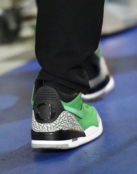 斯蒂芬·库里在今天对阵波特兰的比赛中,上脚了一双俄勒冈大学配色的Air Jordan 3 PE版本球鞋。