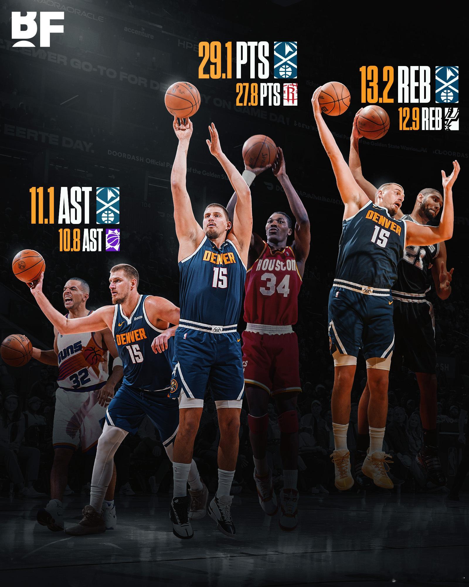 约基奇本赛季数据:🔹场均29.1分——超越奥拉朱旺生涯单季最高场均得分🔹场均13.2篮板——超越邓肯生涯单季最高场均篮板🔹场均11.1助攻——超越基德生涯单季最高场均助攻万中无一的约老师🃏