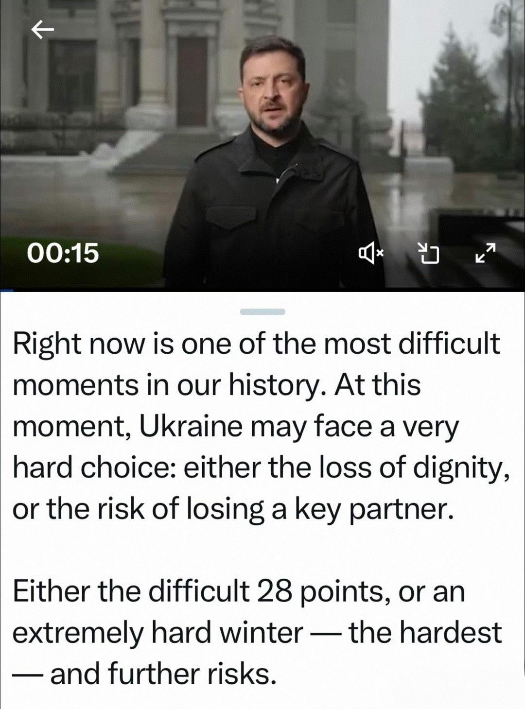 泽连斯基最新讲话:目前是我们历史上最困难的时期之一,乌克兰面临非常艰难的抉择,要么丧失尊严、要么失去关键伙伴…要么接受28条、要么经历严冬,以及更多风险…没有自由、尊严、公正的生活,相信一个已经侵略我们两次的国家…他们在等答复,施加了重大压力…我们会和美国谈,我们不会让敌人有机会声称是乌克兰“不想要和平”。 俄乌冲突无论走向哪里,带给我们的启示从来不是乌克兰会不会投降这么简单,也不是欧盟能不能上桌,或者北约会不会走向分裂。毕竟这些东西都是孙子兵法玩剩下的东西,参考意义不大。我们关心的也不是弱肉强食、先下手为强这个丛林法则,因为这个法则对儒家文化来说,学不会。 对我们最重要的一点是:作为一个大国,应不应该保持自己的国家信用。我们一直信奉人无信不立、国无信则衰。现在到了检验这句话的时候,让我们用五年时间来验证这句话。