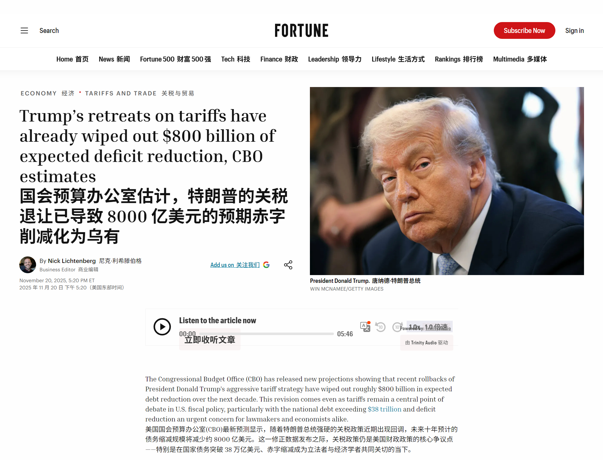 🔻据美国国会预算办公室估算,特朗普的关税退让已导致 8000 亿美元的预期赤字削减计划化为乌有。🔻via fortune