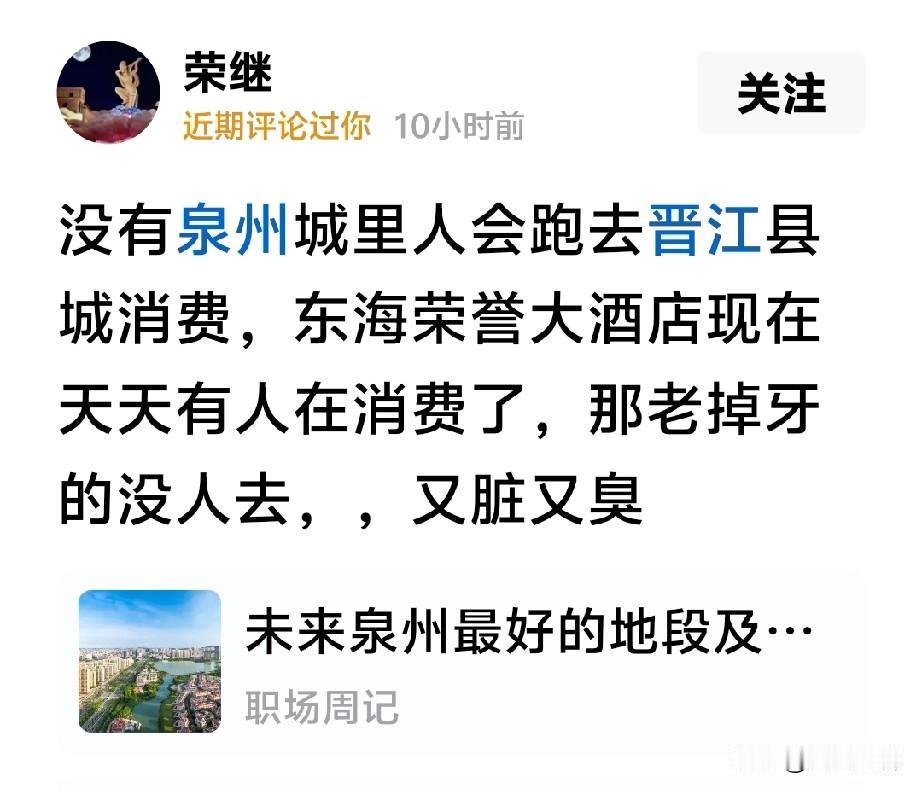 晋江如果只靠你们来消费,商场、酒店早就倒了,至于你说的老掉牙、地方又脏又臭,应该是说你们自己,不信比较一下,就知道了[偷笑][偷笑][偷笑][捂脸][捂脸][捂脸]
