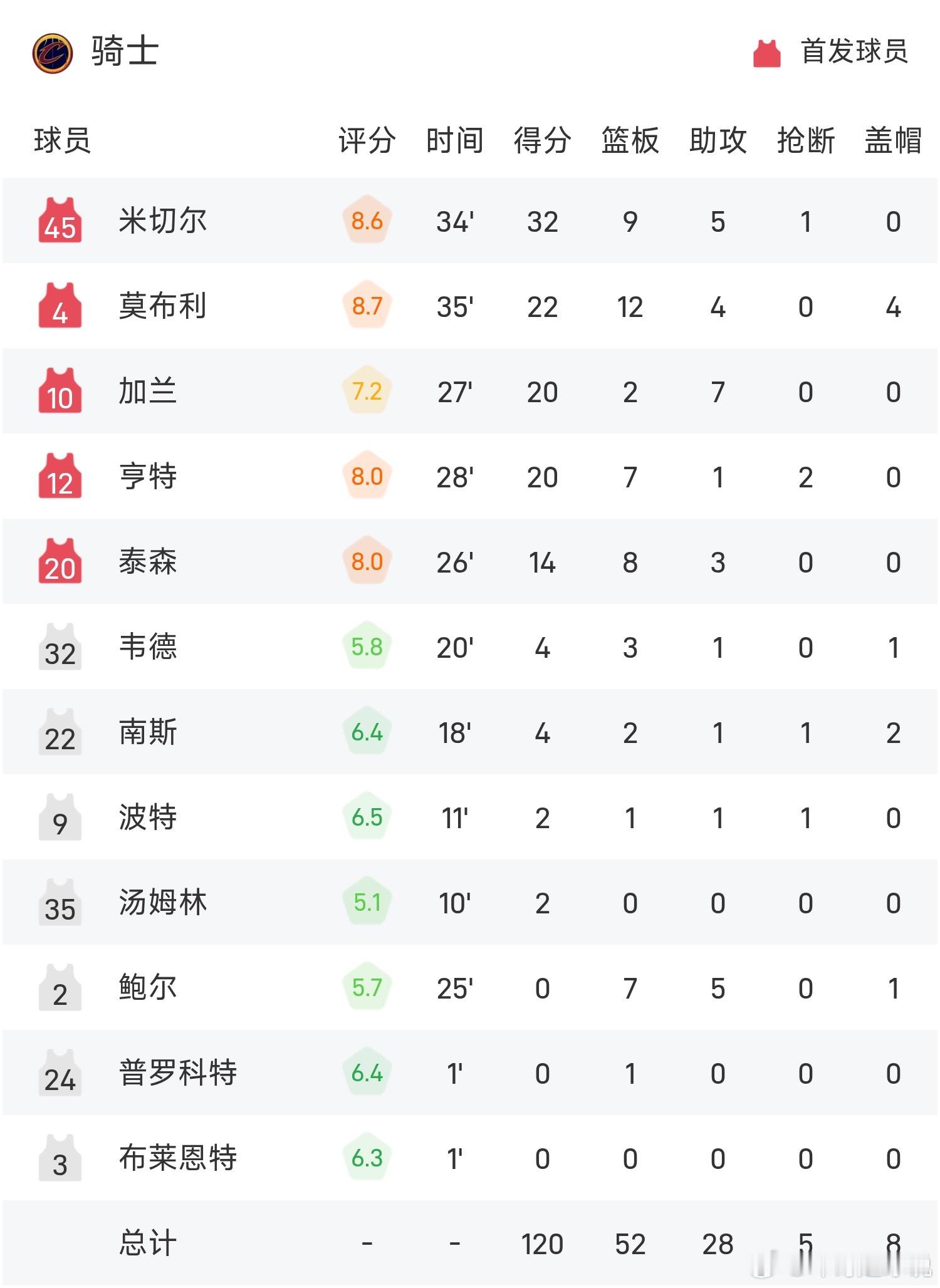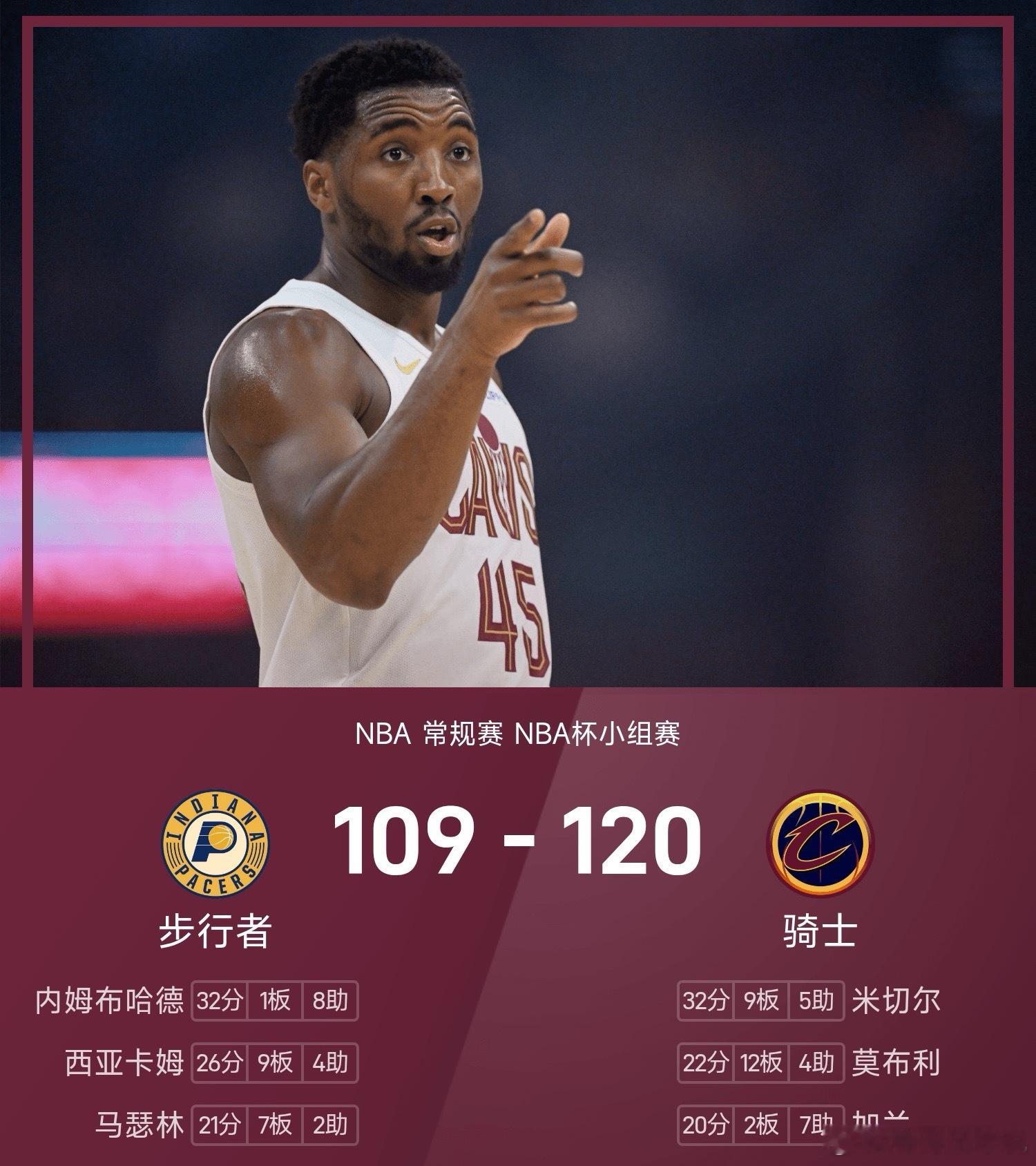 11月22日 25/26赛季NBA 常规赛 NBA杯小组赛,骑士对阵步行者。双方全场战罢,骑士120-109战胜步行者。米切尔得到32分9板5助率领骑士成功取胜,内姆布哈德砍下32分1板8助难阻失利。