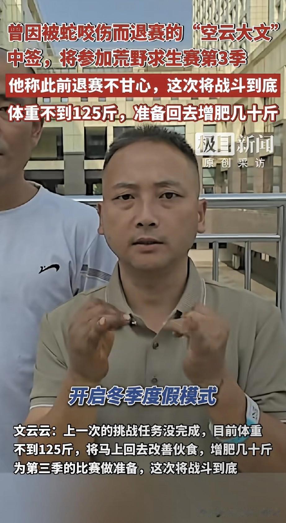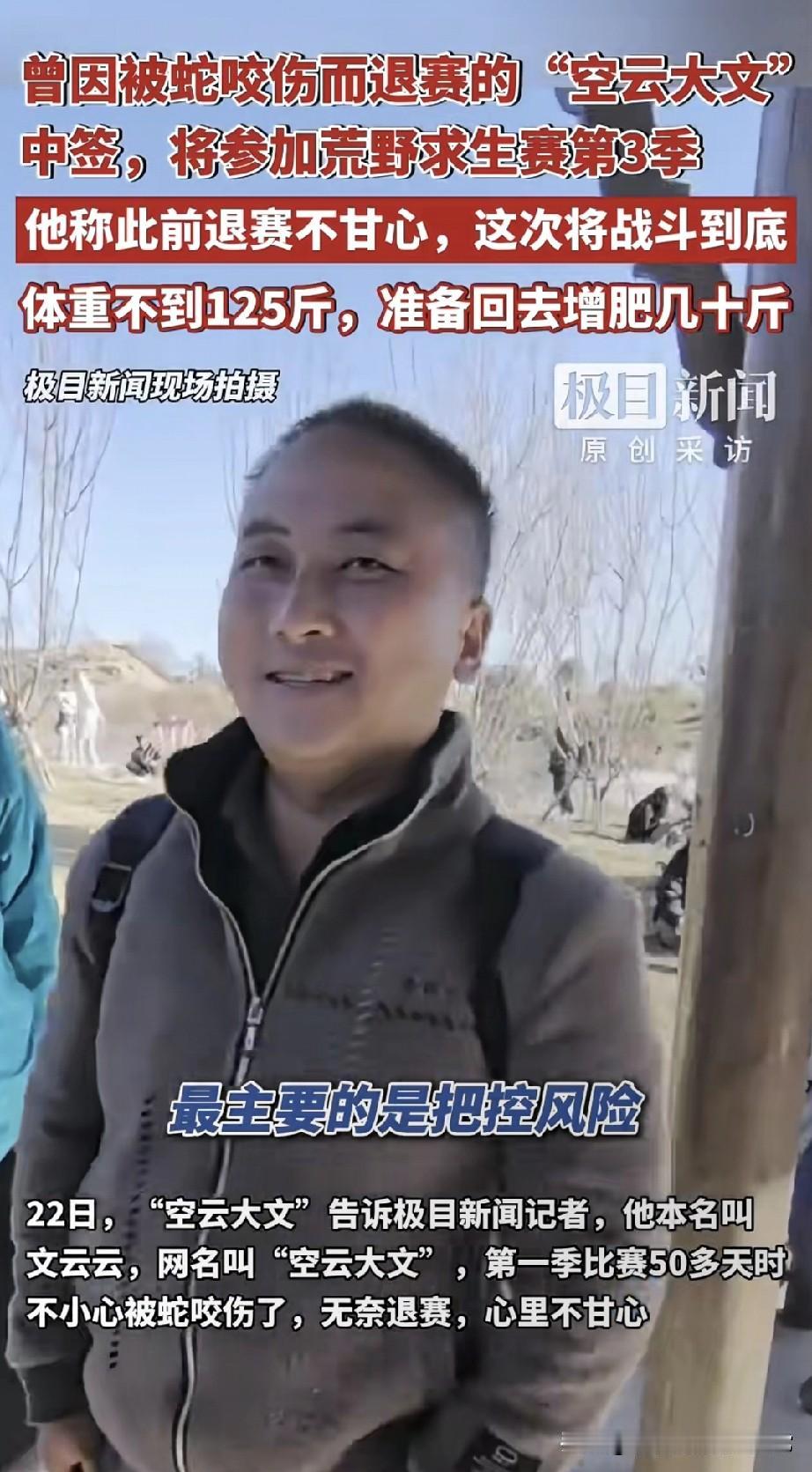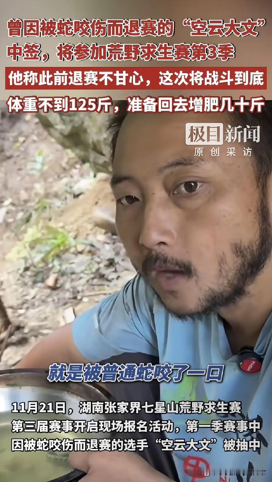 被蛇咬退赛的“荒野狠人”杀回来了! 这次要揣着几十斤肥肉夺50万 张家界七星山现场,我撞见了那个“被蛇咬还嘴硬说‘普通蛇’”的文云云——第一季荒野求生赛刚熬50天,被蛇咬到躺急救床,攥着吊瓶喊“不甘心”。 现在他揣着抽签结果笑出褶子:体重不到125斤,回去要“猛炫饭增肥几十斤”,说“肥肉是荒野里的保命粮”。 有人说他是“拿命换奖金的疯批”,有人赞“这才是荒野该有的狠劲”。可增肥几十斤真能扛过雨林、陡坡? 你赌他能拿50万冠军,还是没熬到决赛又躺医院?评论区押注!