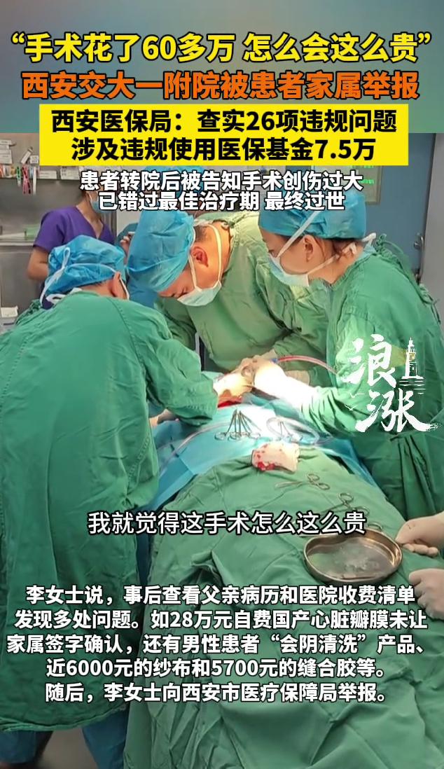 西安一男子花60多万做手术,结果,手术完就昏迷进了ICU,女儿怀疑医院有猫腻,果断转院,但因为错过最佳抢救时期,父亲不幸去世!女儿查看父亲病历和收费清单,发现“会阴清洗”项目,她认为费用有问题,直接向医保局举报,这一查还真查出了问题! 事情得从父亲那次看似平常的头晕说起,本来以为就是小毛病,入院检查治疗几天就能好转,王女士和家人都没太当回事,想着医院是救死扶伤的地方,把老人交过去肯定放心。 可谁能想到,这一住院就成了父亲和家人最后的相处时光,手术做完后老人不仅没醒来,反而直接陷入了深度昏迷,没多久就被送进了 ICU,看着病床上插满管子、毫无反应的父亲,再想想之前医生说的 “手术顺利”,王女士心里的不安越来越强烈,直觉告诉她不对劲。 出于那份为人子女的恐慌和怀疑,王女士果断做了转院的决定,哪怕只有一丝希望,她也想让父亲得到更好的救治,抓住最后一线生机。 可当新医院的医生仔细检查后,给出的诊断结果像晴天霹雳一样砸在她心上,之前的救治造成的创伤太大,老人已经彻底错过了最佳的抢救窗口,现在能做的只剩下维持生命体征,这句话让王女士彻底崩溃了她怎么也想不通,一个简单的头晕,怎么就被治成了这个样子? 最终老人还是没能挺过来,带着遗憾离开了,悲痛之余王女士整理父亲的遗物时,翻出了医院给出的厚厚一沓收费清单和病历。 这 60 多万的账单,是家里为了救父亲几乎掏空家底凑出来的,她想看看这些钱到底花在了哪里。可越核对,王女士的心越沉,当看到清单上一行赫然在目的 “会阴清洗” 项目时,她当场脊背发凉,躺在病床上的明明是自己的老父亲,一个男性患者,怎么会有这样的治疗项目?这到底是哪门子的收费,简直离谱到了极点! 王女士心里的疑虑越来越重,她开始逐行仔细核对每一项收费,这一看更是发现了太多不对劲的地方,在这家号称 “救死扶伤” 的医院里,最普通的医用耗材,价格都高得吓人。 一块平平无奇的纱布,收费竟然接近 6000 元,一瓶普通的缝合胶,也要 5700 元才能拿下,这哪里是在收耗材费,分明是在变相抢钱,一刀刀割向家属本就脆弱的神经。 而最让王女士无法接受的,是那个价值 28 万的国产心脏瓣膜,这么高昂的关键自费医疗项目,医院竟然没有让任何家属签字确认,甚至连最基本的知情权都剥夺了。 在他们一家完全被蒙在鼓里的情况下,这个巨额器材就被 “默许” 用在了父亲身上,王女士越想越气,这哪里还有一点 “医者仁心” 的样子?医生手中的手术刀,难道变成了算计钱财的算盘吗? 父亲的离世已经让她痛不欲生,这些离谱的收费更是在她的伤口上撒盐,王女士没有选择沉默,她觉得不能就这么算了,不仅是为了给父亲讨一个公道,也是为了不让更多人遭遇同样的坑害。她把清单上的所有疑点整理清楚,直接向医保局举报了这家医院。 调查结果出来后,证实了王女士的所有猜疑,并不是她多心而是医院真的有猫腻,经过详细核查,这家医院的收费系统中,违规项目多达 26 项,直接涉及骗取的医保基金就有 7.5 万元。 要知道医保里的每一分钱,都是咱们普通老百姓从牙缝里省出来的救命钱,是全体参保人共同的保障防线,如今却被某些不良机构当成了可以随意套取的 “提款机”,这简直是在践踏大家的信任。 虽然最后查清了真相,违规的医保基金也被追回,但那 60 多万的损失再也无法挽回,更重要的是,一条鲜活的生命永远回不来了,王女士手里那份沉甸甸的病历,记录的不仅是父亲生命最后时刻的痛苦,更是医疗监管之下必须直视的漏洞。 治病救人本是医生的天职,可当这份职业变成了纯粹的逐利游戏,患者不仅要承受病痛的折磨,还要时刻提防那双伸向钱包的黑手,这实在太可怕了。 (信息来源:浪张新闻)