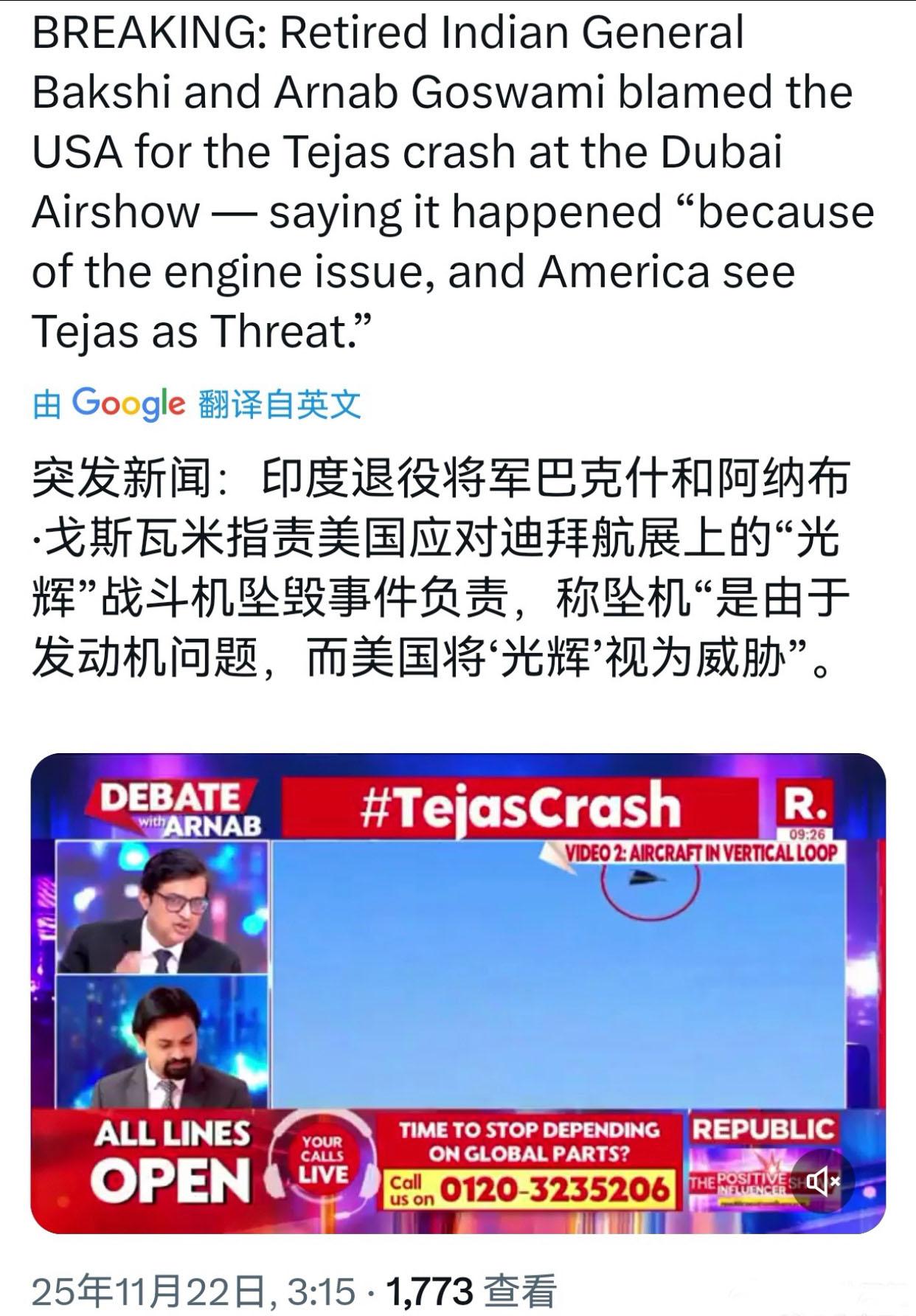 经历惨痛坠机事故后,印度人似乎已经找到的坠机原因。印媒报道称,可能是美国提供发动机有问题,毕竟美国现在和印度关系不太好。这位印度退役将军称,美国提供发动机有问题,而且美国将“光辉”视为竞争对手,因此故意使绊子。 不得不说,印度这脸皮可不是一般的厚,相当于主动承认所谓国产自研就是个笑话,关键零部件来自欧美等国家。另外LCA“光辉”打造了几十年,到现在连印度空军都嫌弃不想要,居然还有脸说这是美国竞争对手。