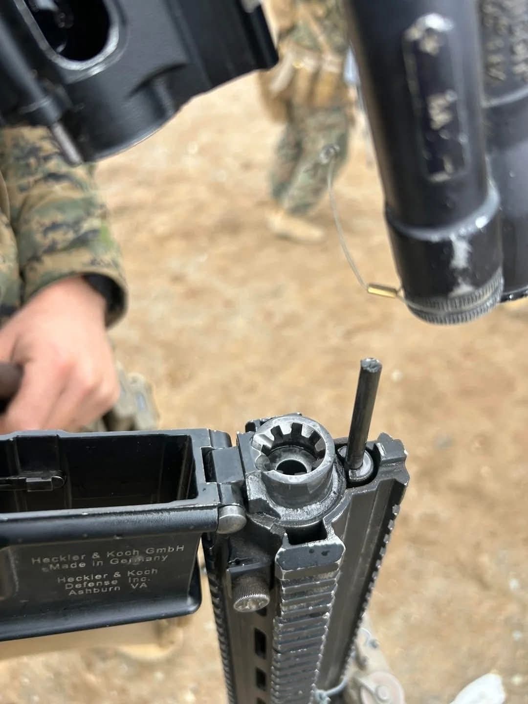MD四等人的HK416上机匣连结枪管的部分直接断裂,目前详细原因不确定,一说是因为416前端太重,又加上短行程活塞的高速抽插,在5万多发弹药的射击后就华丽的断掉了