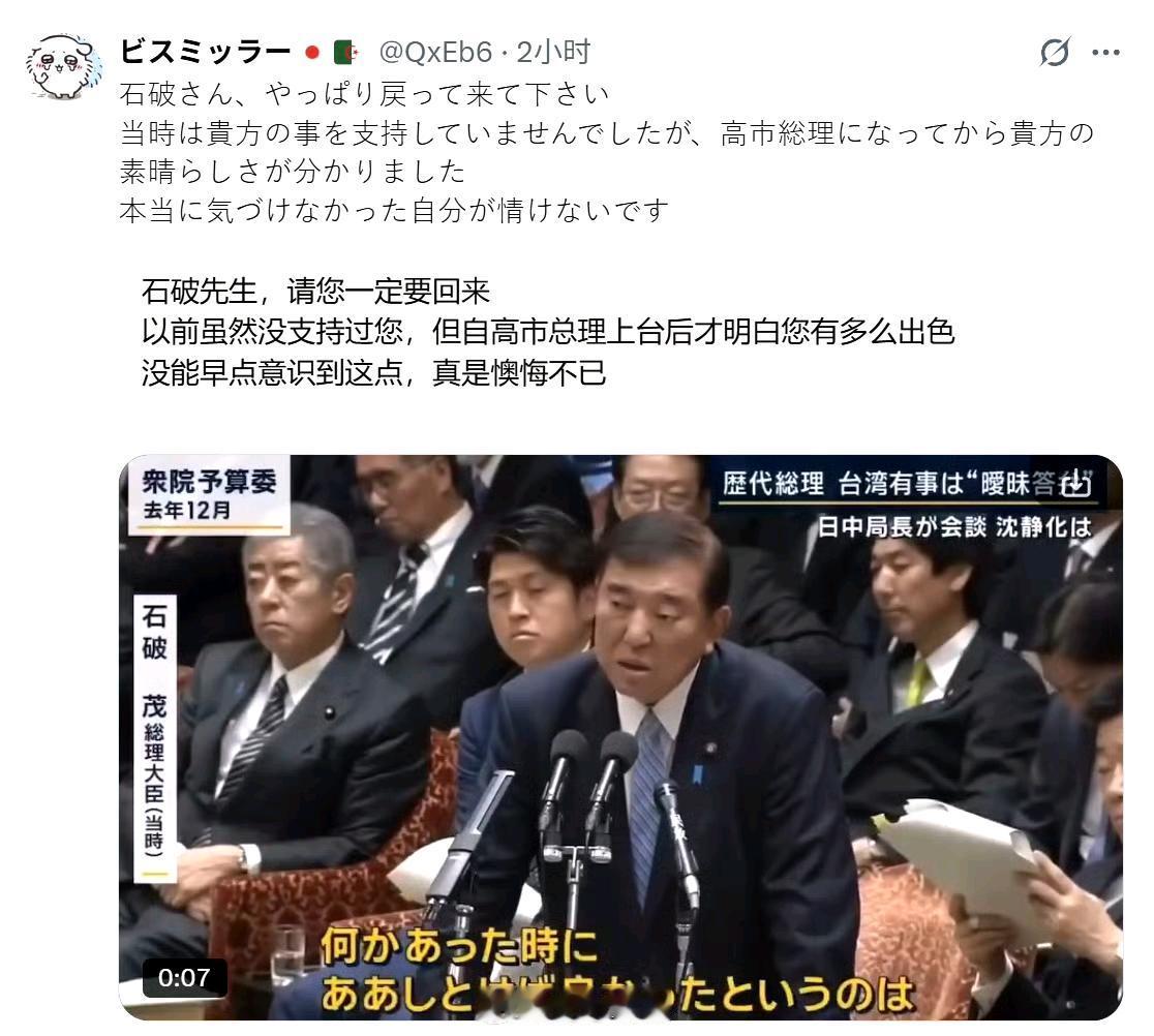 石破茂今天的帖子没看懂,不知道一望无垠的沙漠代表着什么,也不知道在沙漠里面步履艰难的几个人代表什么意思,更不知道云海翻腾是否表示风暴即将来临。但日本网友的意思我看懂了,那就是:怀念石破茂,希望他重执首相宝座。估计石破茂看了评论会说,我在位的时候你们让我滚,我现在已经滚远了,一时半会儿滚不回来,你们先自求多福吧。