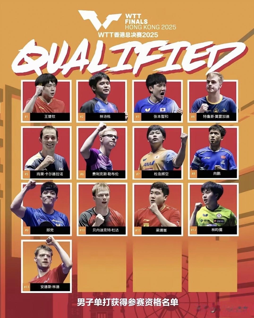将于12月10日在香港开战的乒乓球年度总决赛确定了16个男单参赛席位,中国队有王楚钦、林诗栋、向鹏、梁靖崑四人入围,法国有三人,分别是勒布伦兄弟和西蒙·高茨,日本和德国各有两人,分别是张本智和、松岛辉空、邱党和杜达,另外五席归属瑞典的莫雷加德、巴西的雨果、中国台北的林昀儒、丹麦的林德和韩国的安宰贤。另外,女单方面中国队有7人入围,混双方面林诗栋/蒯曼入围,同时入围的还有香港老将黄镇廷/杜凯琹。