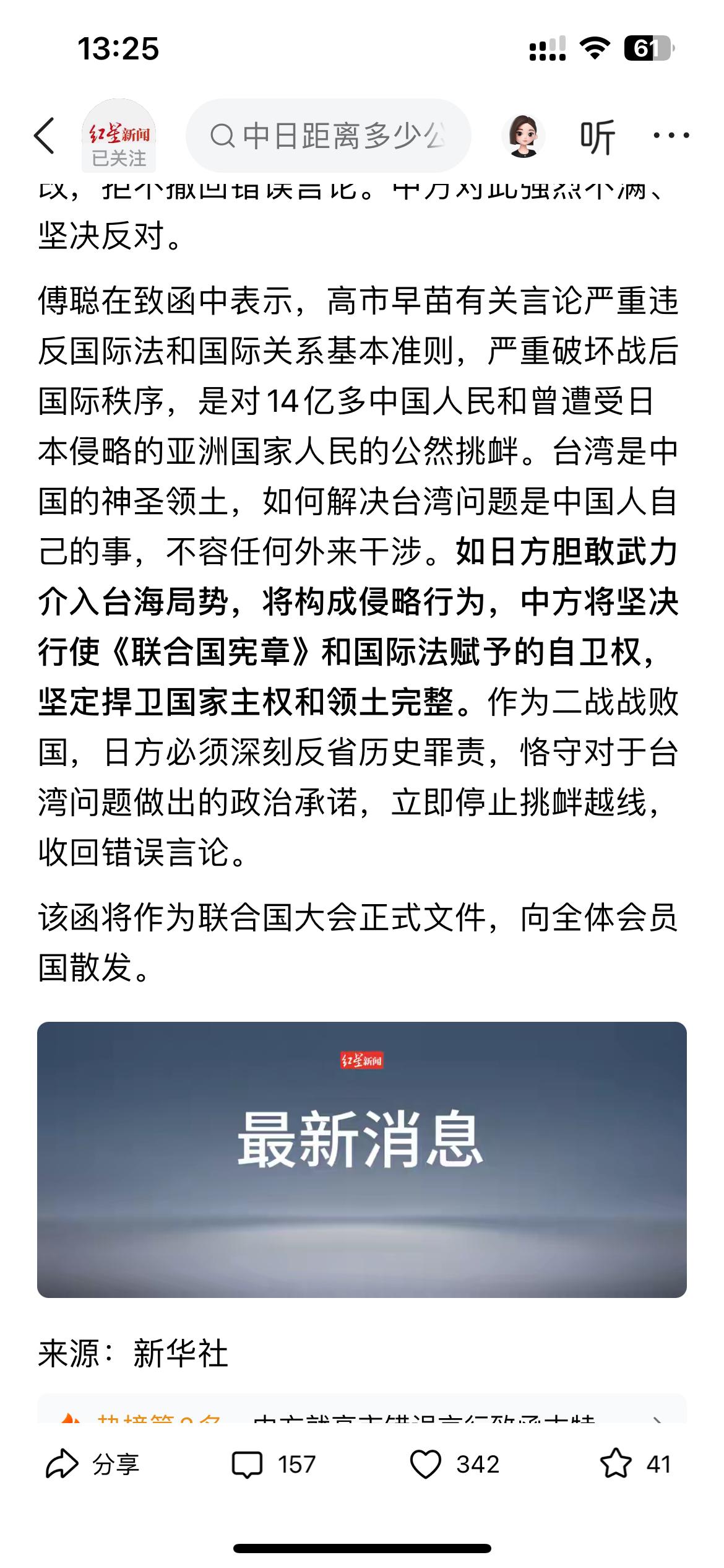在继续加强度了!这是把我们行使自卫权提前告诉国际社会了,别到时说我们没有“勿谓言之不预”也! 在日本拒不撤回高市早苗武力威胁介入台海局势的涉台言论,同时拒不道歉!真是“士可忍孰不可忍” 一个二战战败国的日本,有何脸面如此猖狂,这还是二战战后的国家秩序吗?一个二战战败国,竟然敢武力威胁二战战胜国,时至今日的中国,岂可容忍日本如此倒行逆施的行为! 这一次我们向联合国秘书长古特雷斯发函,阐述我们的立场,同时该函作为联合国文件,向所有会员国散发!日本胆敢武力介入台海局势,将构成侵略行为,该行使联合国宪章和国际法赋予的自卫权的是我们! 这是把我们的自卫权行使前提提前告诉国际社会了,别到时说我们没有“勿谓言之不预”也!