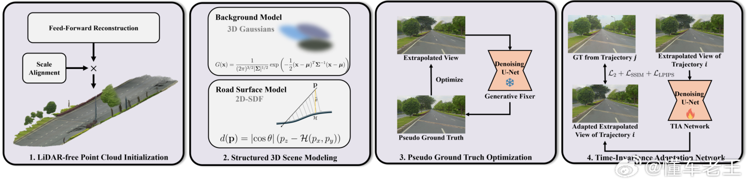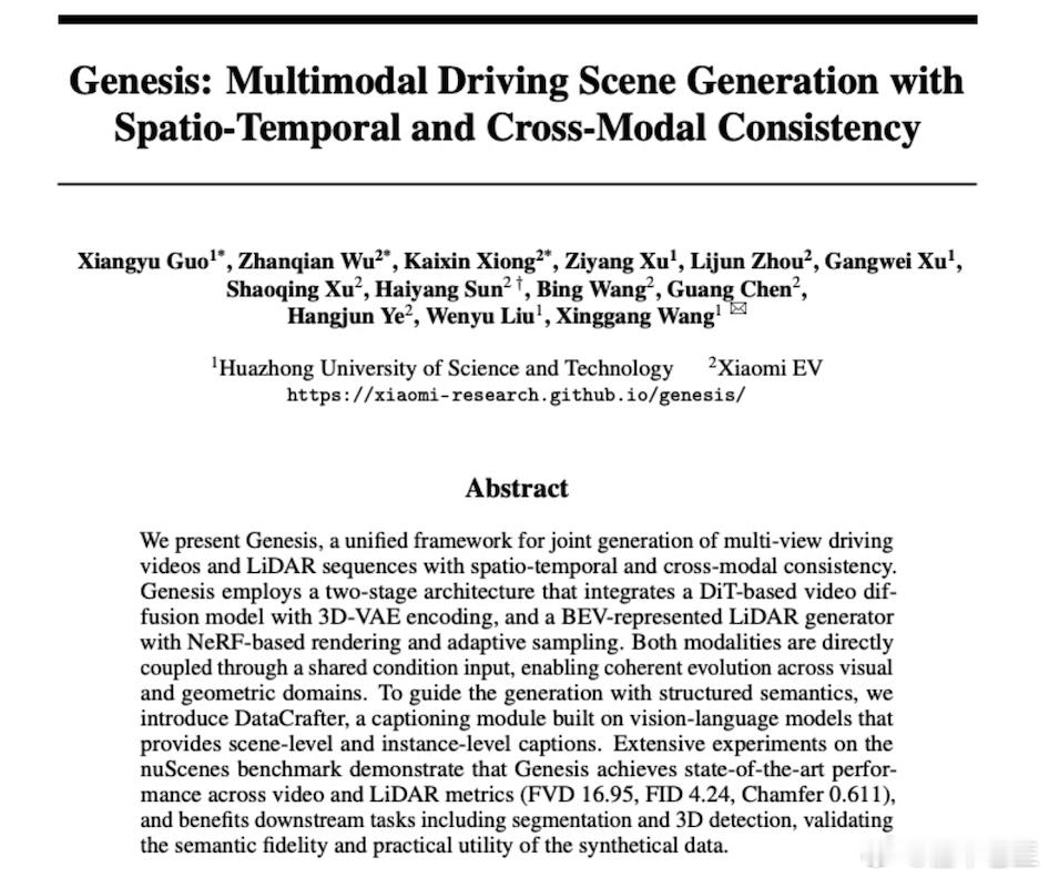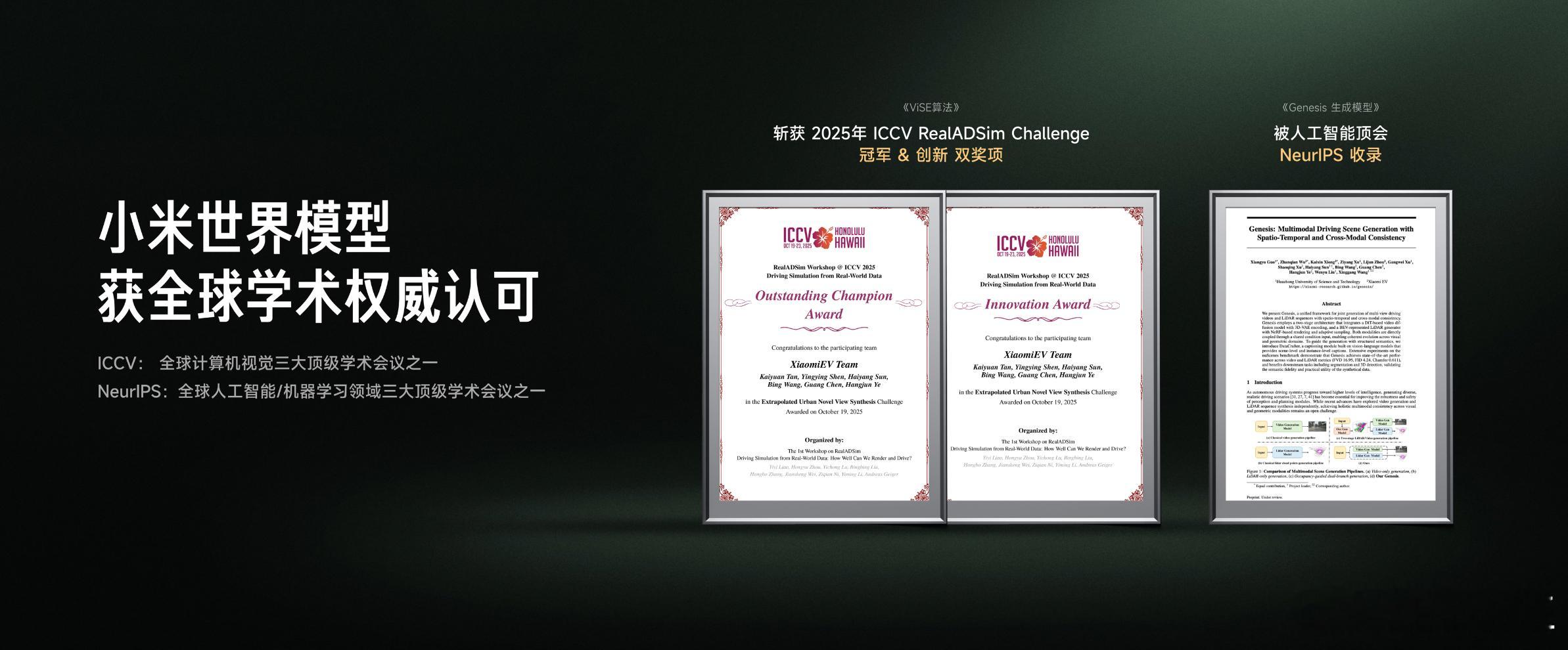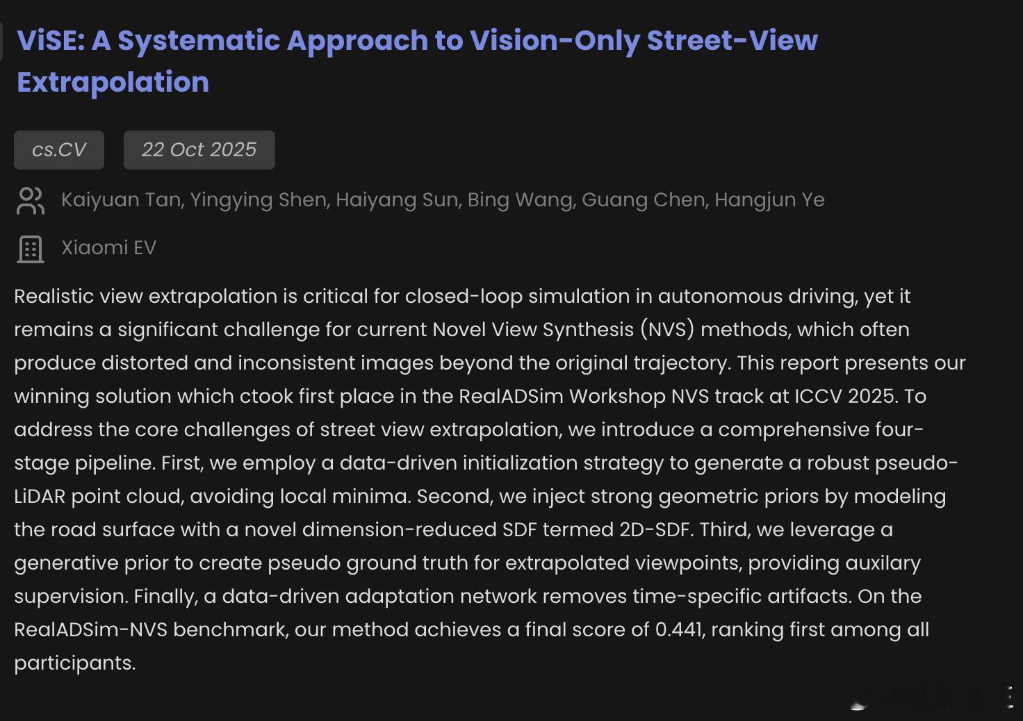 24年3月28日小米SU7发布,到25年11月20日,602天50万辆下线,手机、 智能家电、 新能源车,三个万亿级别市场的增量规模和速度确实令很多厂家侧目。 本次2025广州车展中,小米有个世界模型的相关信息还挺有意思的,就是ViSE 算法在 计算机顶刊ICCV 2025 - 自动驾驶方向仿真合成数据专业挑战赛中荣获冠军,这个大体来说啥意思呢?老王去阅读了一下这次高度相关的两篇论文《ViSE: A Systematic Approach to Vision-Only Street-View Extrapolation一种基于视觉的街景外推系统方法》和《Genesis: Multimodal Driving Scene Generation withSpatio-Temporal and Cross-Modal Consistency》 这2篇文章作者也高度重合,我总结了第一篇文章的几个关于外推的点,也学习了一下,还挺有意思的。 第一,自动驾驶在做仿真测试时(注意⚠️行业中一般直接称自动驾驶,转到舆论时需提醒法规目前无自动驾驶仅辅助驾驶,用户注意甄别),需让车辆“看到”它本来没有看到过的画面——比如从更高的视角、稍微偏一点的角度、或者车子假设往旁边挪了一米之后的街景。但现有问题就是说,一旦偏离原来的路线,就容易画面变形、透视也做的不好,镜头边缘也是糊的,那么小米这次比赛的方案就是想办法补全和外推未来的街景,他们大概有4步,第一步就是生成一个靠谱的伪激光点云,传统情况去让模型推测一个它没见过的景深结构,很容易猜错。所以小米的做法说白了就是先用大规模数据去让机器学到的一些“经验规则”,生成一个比较靠谱的3D点云骨架。就像我们画画一样,描骨架。然后进入第二部就是给模型描述一个地面,而且是连续平整的地面,这里面小米提到了一个专业名词叫做2D-SDF二维有符号距离场的概念,这个概念之前在高清矢量边界建模方面以及机器人路径规划方面常见,用这个降维的方式去减少错判和黏糊。 前面不是说要去延展到没拍到的未来视角么;那么第三步是生成模型,提前给个方向,类似目前行业里用到的Diffusion、GAN一类的(或者换种说法,2D-SDF 本身不是生成模型的动作,但它经常作为Diffusion / GAN 生成的中间过程)。最后就是第四部,用专门的一个自适应网络去清除鬼影和闪烁,尽量保证整个视频的连续,那么他们的方法在RealADSim-NVS 的评分里拿了 0.441,排名第一。【图789 为《Genesis: Multimodal Driving Scene Generation withSpatio-Temporal and Cross-Modal Consistency》篇幅有限,后续补充】另外,小米近期受舆论冲击主要是在宣传用语和用户对接节奏上面,技术宣发和边界之前的模糊处理今后建议修正为更精准、更严肃的技术解析,产品信息期待进一步透明化、白盒化。 老王认为,造车本身就是高风险、重资产行业,新玩家易被放大审视。舆论造神后的“毁神式做空冲击”也是考验车企公关耐性与资本抗荷能力的试金石,扛住之后,后续很多问题都会形成方法论和SOP。近期从产业角度看,无论是自研底盘/电控的升级动作、YU7的24 小时耐力测试、CEC 冠名,ViSE +仿真体系、还是这次的50万辆大规模下线,都说明小米汽车正试图持续加注工程能力。