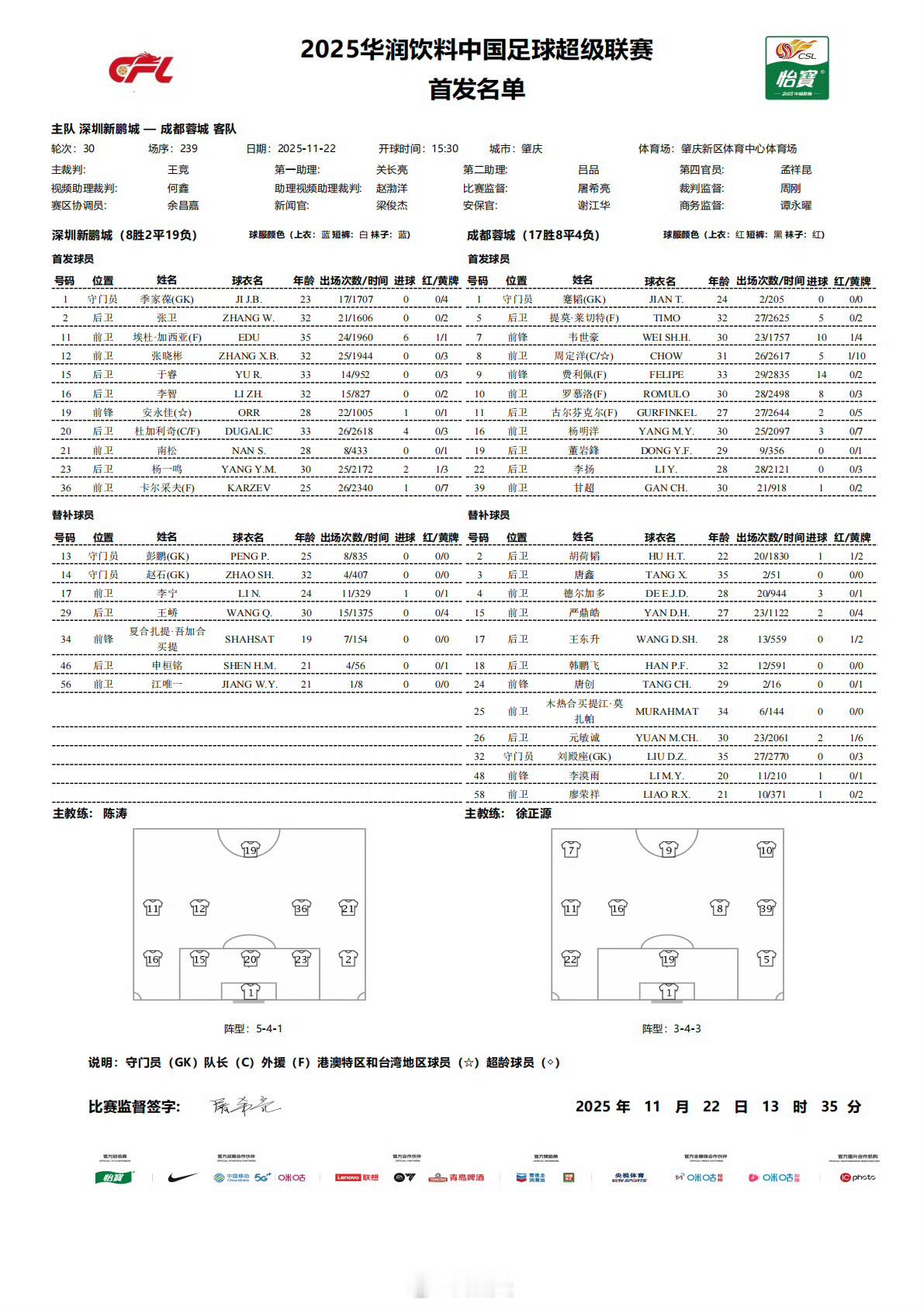 中超收官战,双方首发出炉!三外援vs四外援,韦世豪、蹇韬首发,胡荷韬替补。PS:深圳只有5个替补! |