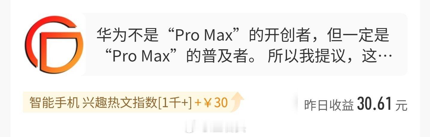 woho,这条又给了30激励,看来平台对这类内容非常认可,看来我以后得多发点这种正向的优质内容。这里再重申一下,华为不是“Pro Max”的开创者,但一定是“Pro Max”的普及者,所以我们以后就叫“华为Pro Max”。