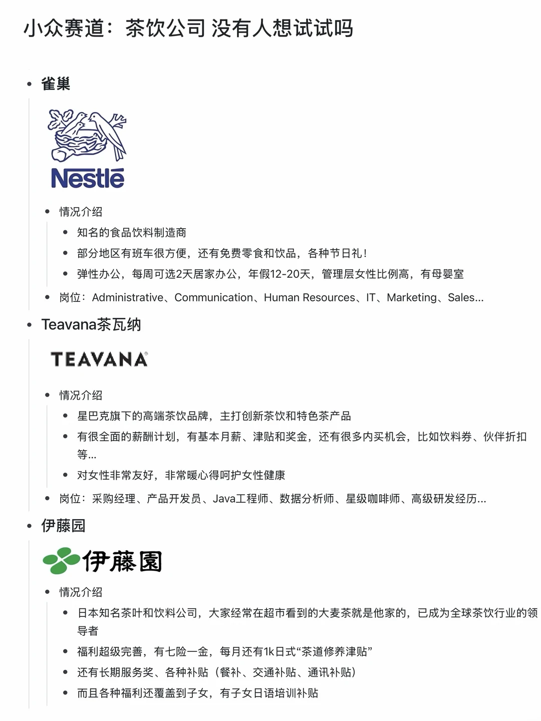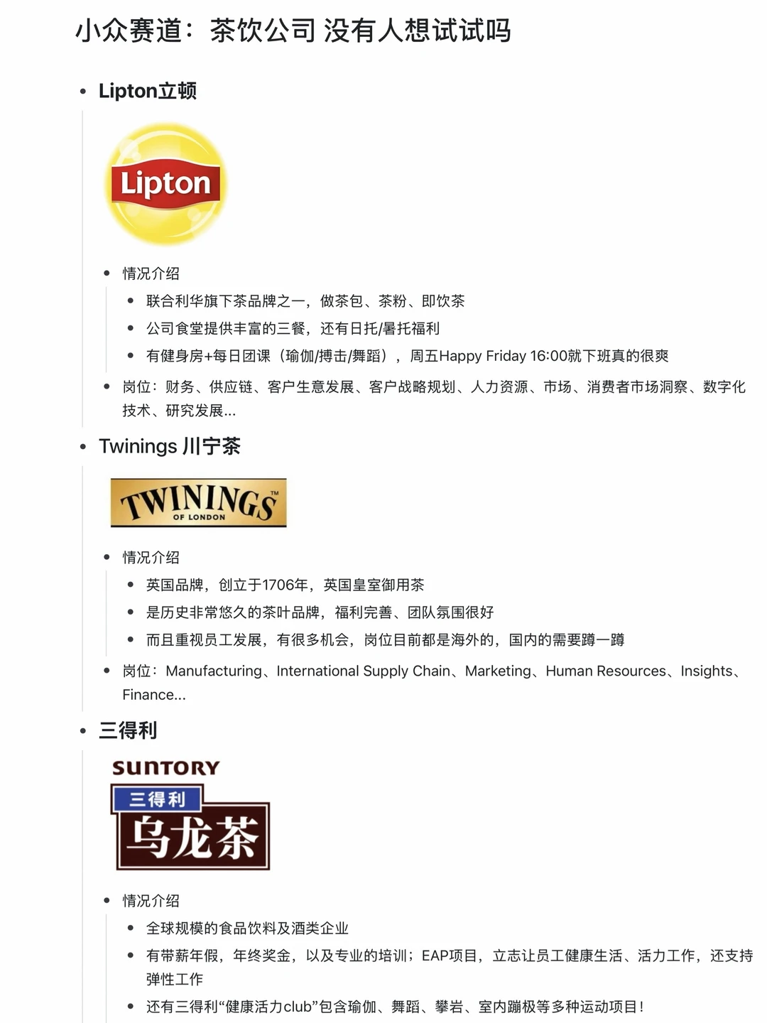 茶饮赛道看着小众,但外企在这块其实一直很稳,像做茶原料、茶叶供应链、饮品研发的,都在国内长期扩招,像研发、市场、销售、质检、供应链、食品安全这些方向都可以大胆投 · 为什么建议试试茶饮外企? ▪️发展稳定,饮料供应链需求大,不容易受到行业波动 ▪️大部分都是955作息、年假15天以上 ▪️福利齐全,五险一金+补充医疗,对女性也很友好 · 坚持日更✊🏻,帮大家在找工作路上顺利拿 offer!