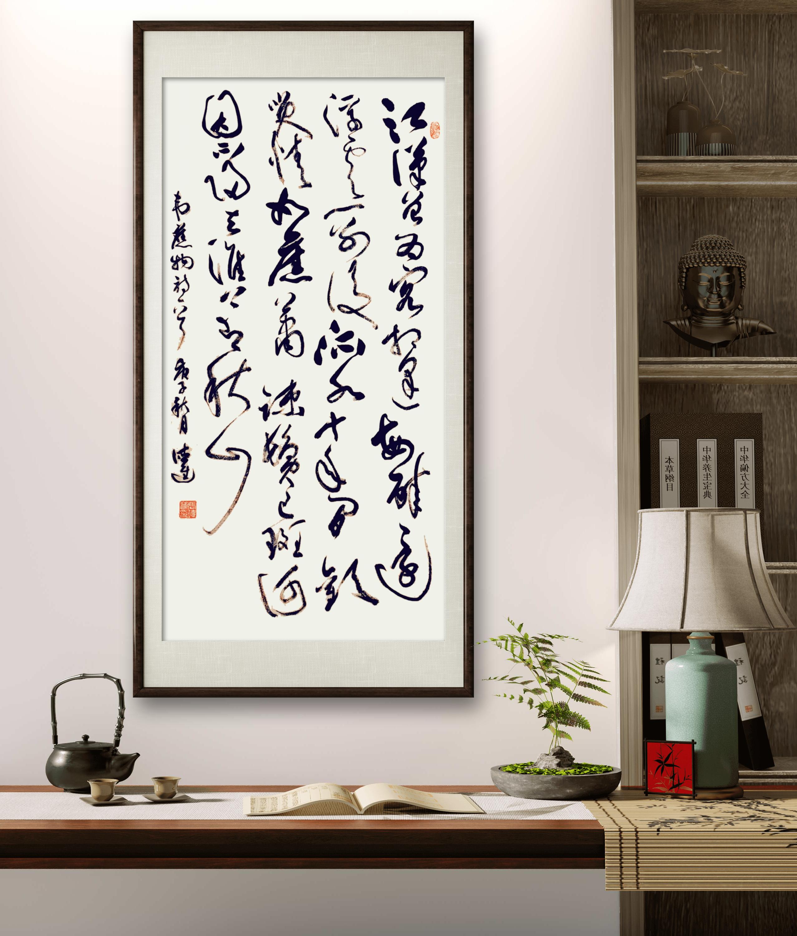 淮上喜会梁川故人 韦应物 江汉曾为客,相逢每醉还。 浮云一别后,流水十年间。 欢笑情如旧,萧疏鬓已斑。 何因不归去?淮上有秋山。 草书笔墨飞动如茶烟轻飏,韦应物 “浮云一别后,流水十年间” 的诗意随线条流转。笔势的枯润浓淡,恰似茶汤的清冽回甘,狂放中藏蕴沉敛。墨色漫漶处映着茶盏流光,字句间的留白如茶香袅袅,让故人相聚的温煦与时光沉淀的淡然萦绕一室。观之,心随笔走,茶伴诗行,喧嚣渐远,只剩禅意与知己相逢的暖意,为茶室添一份古雅清宁的韵致。