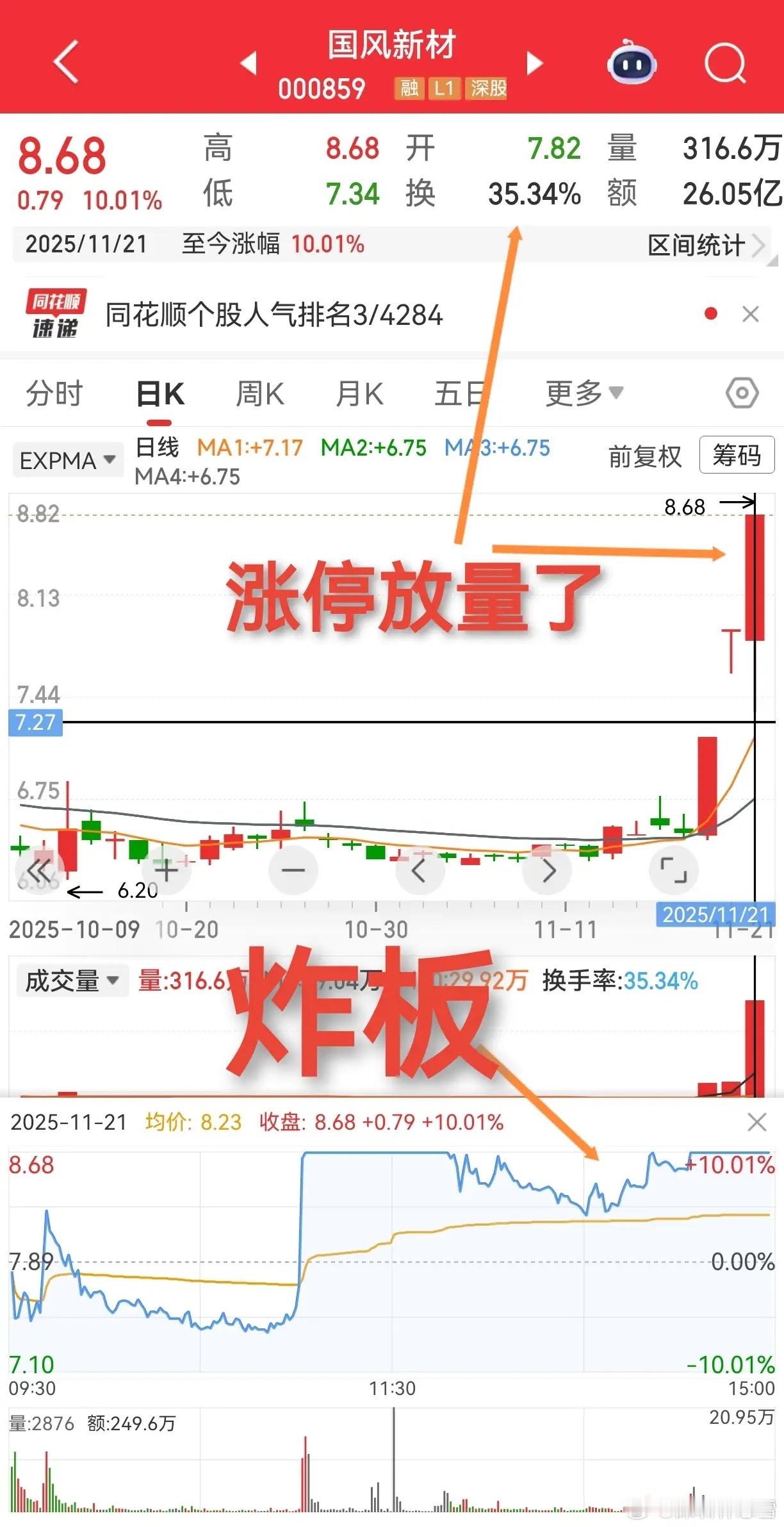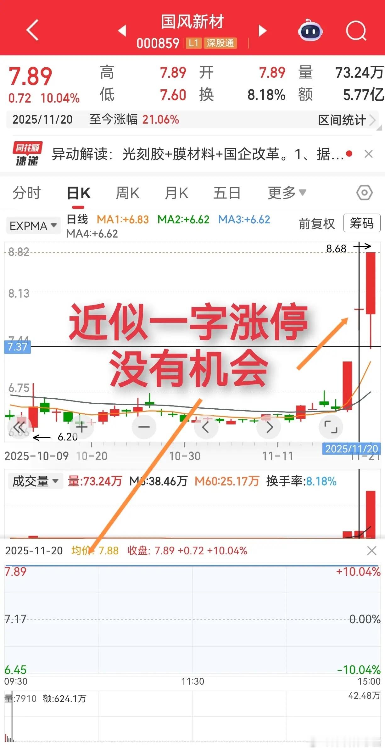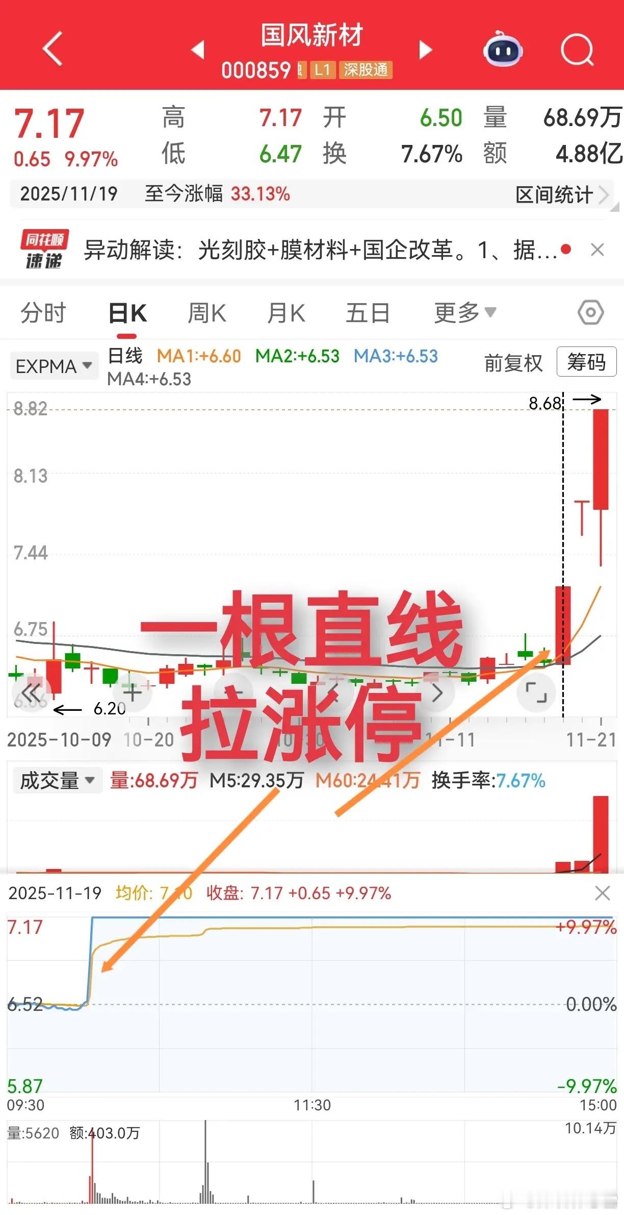 有些牛股,真的是可遇不可求呀~国风新材就是这类!之前做过也一直放在自选,朋友问我的时候,看它成交量平平、趋势刚走平,还以为要夯实底部,没太在意~结果第二天盘中直线封板,等发现已经来不及了!后面要么涨停开没机会,要么高位放量怕出货,只能眼睁睁欣赏~ 错过第一天,基本就和这波行情错过了,大概这就是炒股的缘分吧😂