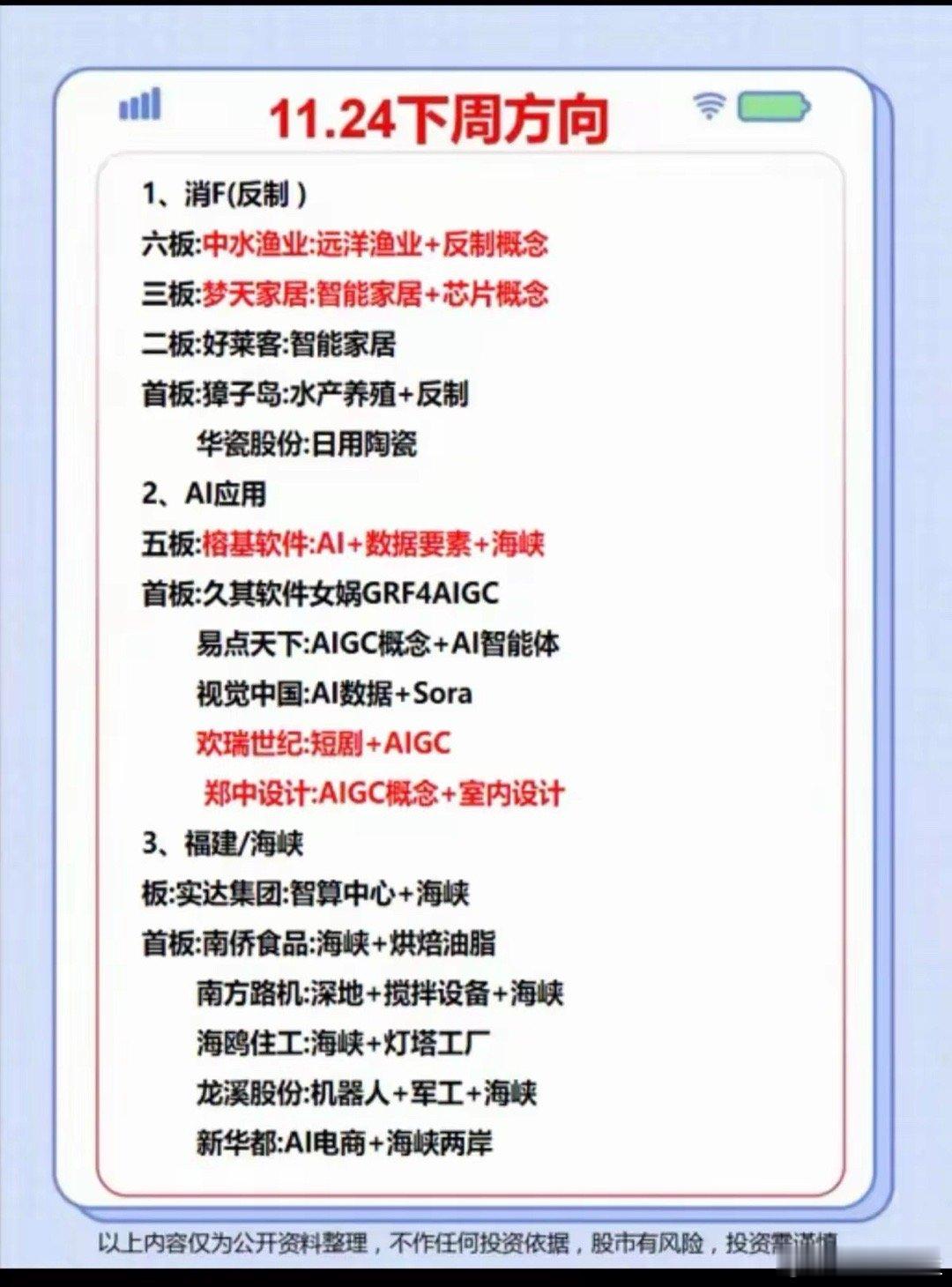 下周A股这些板块将大涨!!!日本首相拒绝收回台湾相关言论,中日矛盾升级愈演愈烈,下周对日反制题材依然有较大炒作空间,对日替代板块、军工板块有望继续走强;谷歌官宣发布新一代图像生成模型,3D打印概念、AI智能体板块有望进一步走强!!!下周,谁会杀出重围,值得期待!!!