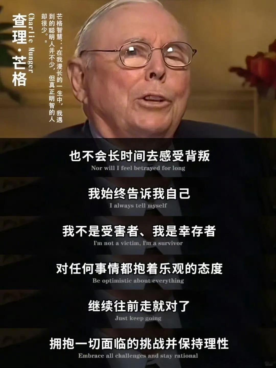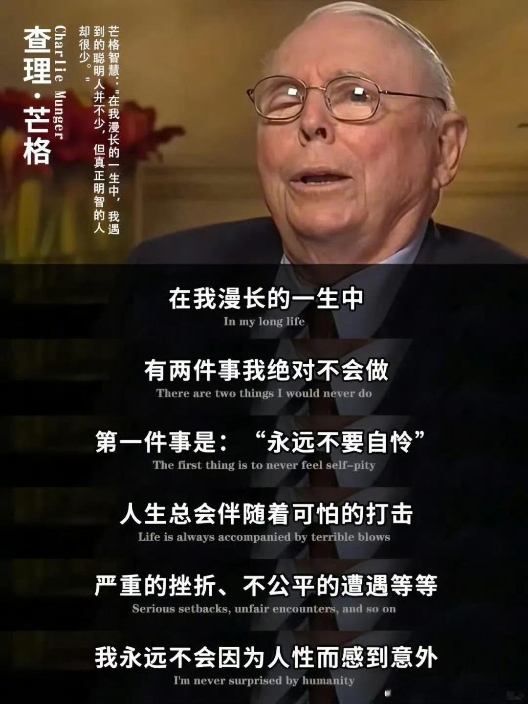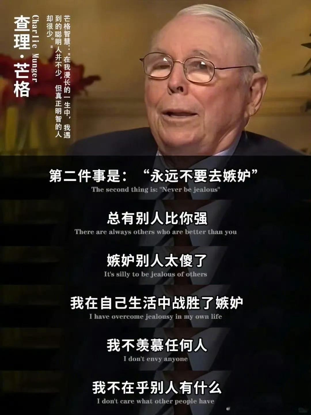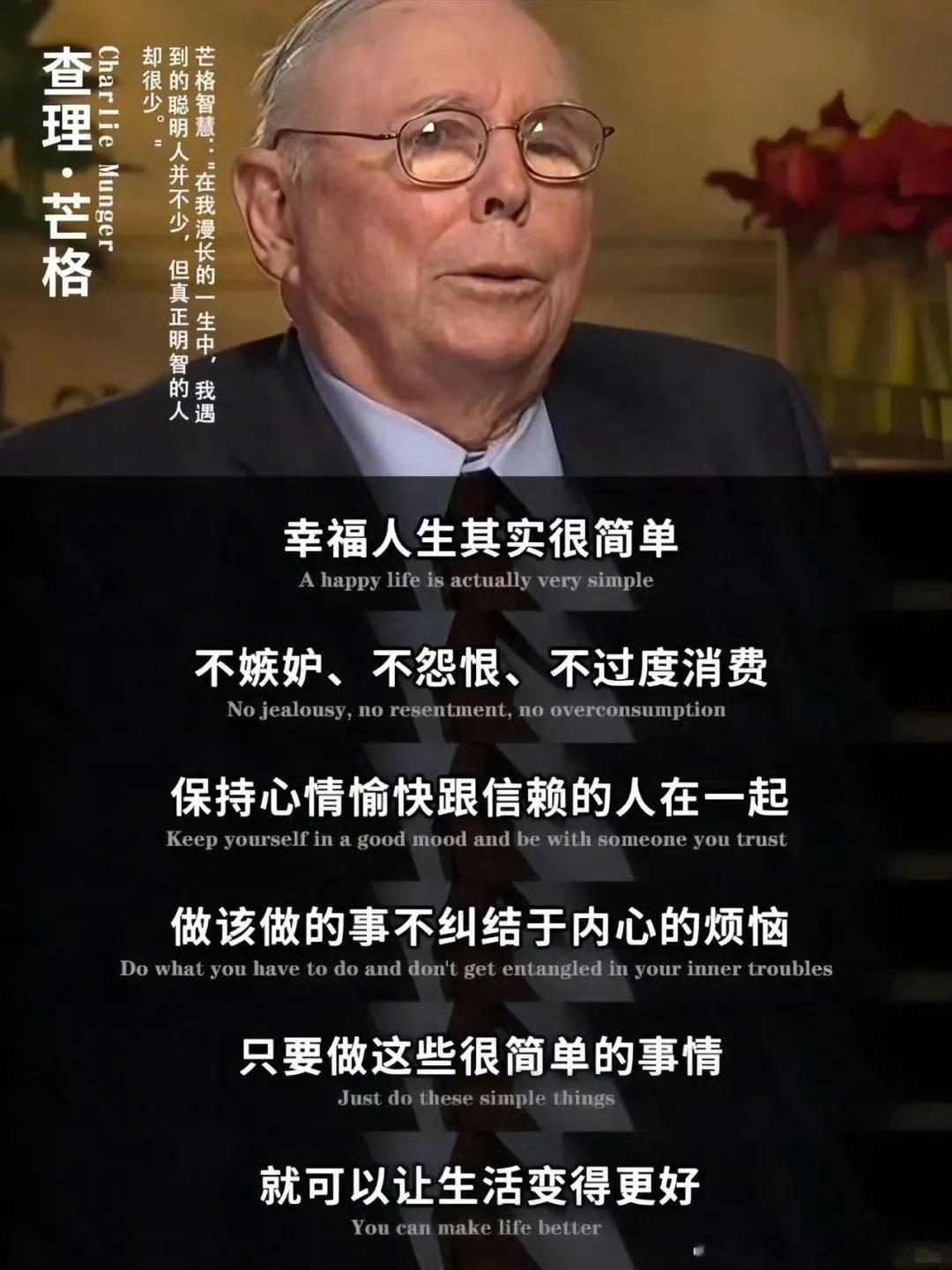 查理·芒格:我一生中有两件事绝不会做我不羡慕别人我不在乎别人有什么幸福的人生其实很简单不嫉妒,不怨恨,不过度消费保持心情愉快跟信赖的人在一起做该做的事不纠结于内心的烦恼只要做这些很简单的事情就可以让生活变得更好