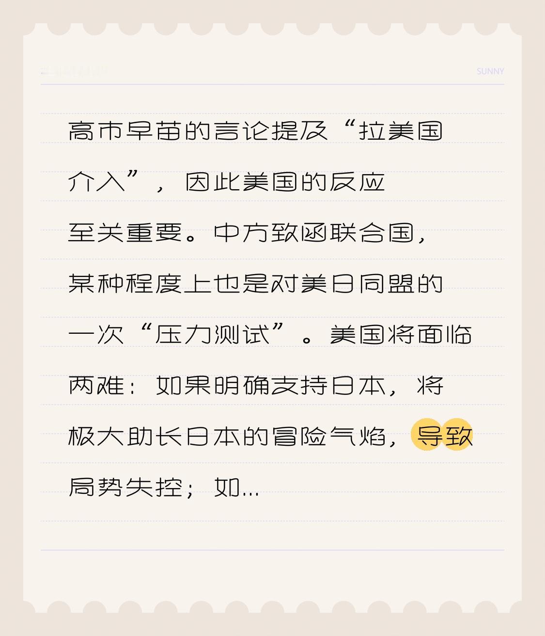高市早苗的言论提及“拉美国介入”,因此美国的反应至关重要。中方致函联合国,某种程度上也是对美日同盟的一次“压力测试”。 美国将面临两难:如果明确支持日本,将极大助长日本的冒险气焰,导致局势失控;如果与日本言论保持距离,则会暴露美日同盟内部的裂痕。预计美国会采取“战略模糊”策略,一方面重申对盟友的安全承诺,另一方面呼吁“保持克制”,避免直接卷入与中国的军事对抗。
