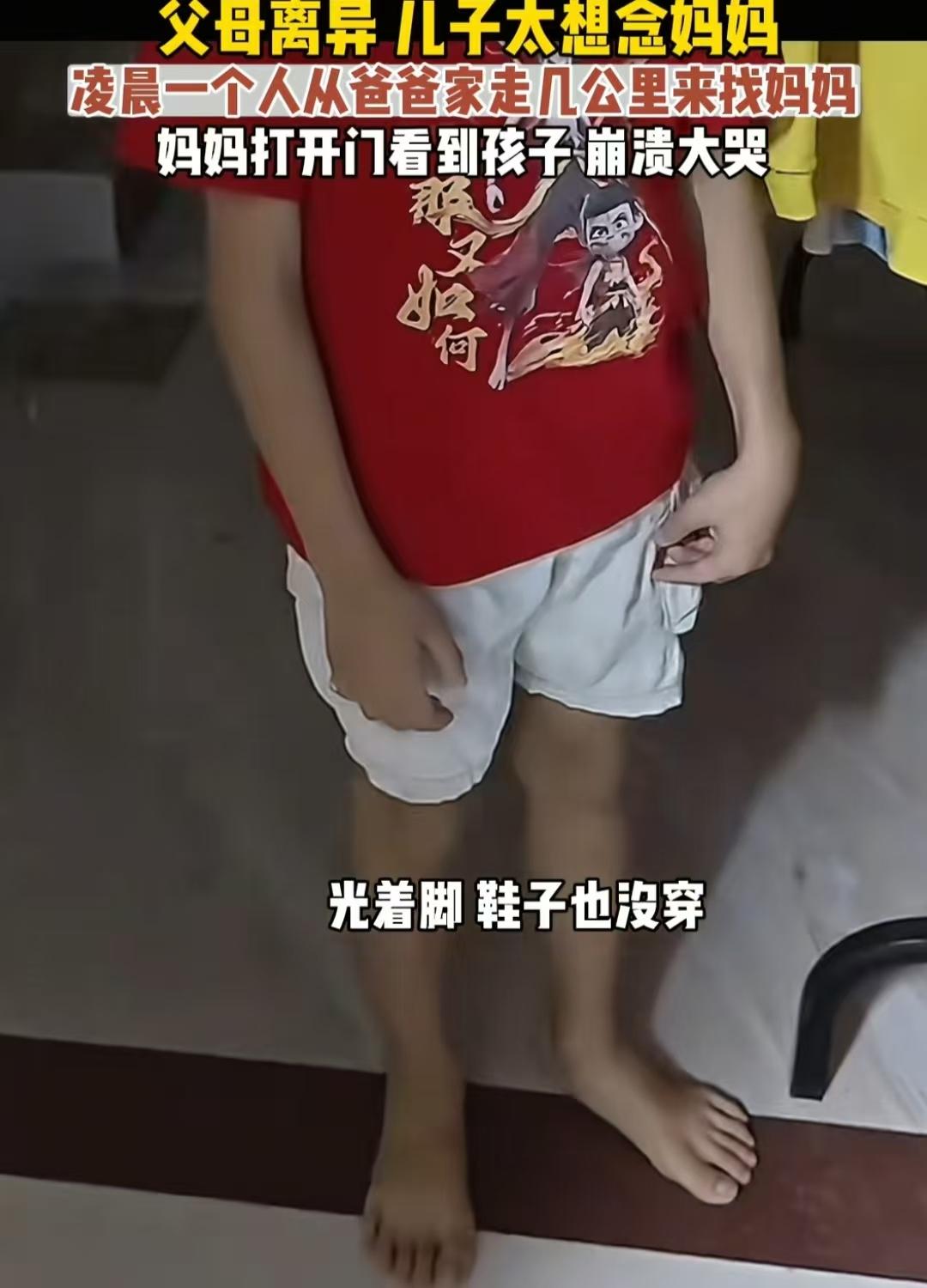 父母离异,儿子太想念妈妈,凌晨一个人从爸爸家走几公里来找妈妈,妈妈打开门看到孩子,抱着他崩溃大哭。这个孩子目测6岁吧,大概是夏天,孩子穿着短衣裤子,光着脚丫,妈妈打开门,看到门外站着的孩子,可能他也不确定妈妈到底在不在家?会不会要他?一只手不停地抓着裤子,他内心应该充满了不安,小小的孩子,看着让人心疼不已! 不禁想问,孩子的爸爸知道吗?是受了很大的委屈才出来找妈妈吧?也或者是一直被忽视,突然想妈妈了? 大部分孩子都是一家人手掌心的宝,有些孩子,生下来就比较苦吧!都是父母造的孽!