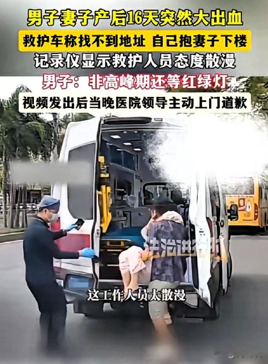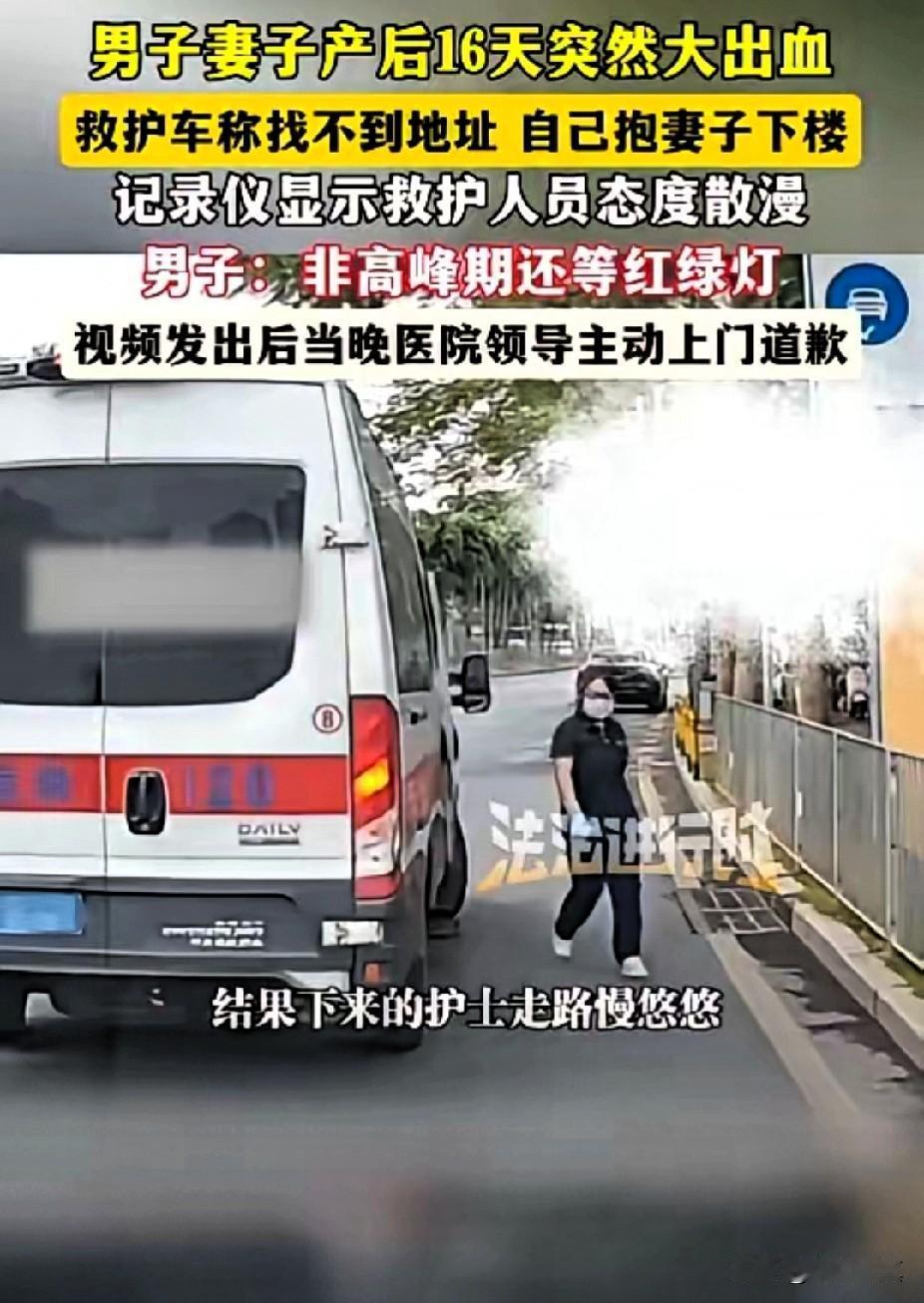 120救护车变成观光车,医护人员无医德,医院道歉惹争议 深圳初冬的寒夜,本应是母婴安歇的静谧时刻,盛先生家中却上演着惊心动魄的生死竞速。产后仅16天的妻子突发大出血,面色惨白的模样让他瞬间崩溃,颤抖着拨通120的手指,攥着的是全家人的希望。 然而这份希望,却在救护车抵达前就蒙上阴影。接线后的司机多次表示无法定位小区具体位置,情急之下,盛先生不顾妻子虚弱的身体,咬牙将她从楼上抱下,一步步挪向小区门口。寒风吹透单薄的衣物,妻子微弱的呻吟和不断渗出的血迹,让每一步都沉重如铅。他以为抵达约定地点后,就能迎来专业高效的救援,可眼前的景象却让他从头凉到脚。 救护车缓缓停下,医护人员不急不慢地从车上走下,动作散漫得仿佛只是日常巡查。更令人窒息的是,一名工作人员打开半扇车门后便驻足不动,即便看到盛先生抱着大出血的产妇艰难走来,也未曾上前搭手,更未主动敞开另一扇车门方便转运。全程没有紧急的指令,没有专业的应急处理,只有与生死时速格格不入的冷漠。 事后盛先生将这段视频公之于众,画面中医护人员的懈怠与产妇的危急形成刺眼对比。网友们怒不可遏:"救护车是生命通道,不是观光车!""面对产后大出血的产妇如此漠视,简直是拿人命当儿戏!"医护人员的本职是救死扶伤,紧急救援中每一秒都关乎生命安危,经验丰富的司机应熟悉路况,专业的医护更该时刻保持应急状态,可这场救援中的疏忽与散漫,无疑触碰了职业底线。 当晚涉事医院领导虽登门道歉,但公众的质疑并未平息。救护车作为特殊车辆,闯红灯的特权背后,承载的是社会对生命至上的期许。无论是司机的路线不熟,还是医护的应急迟缓,暴露的都是责任意识的缺失。希望这场风波能敲响警钟,让每一位急救从业者牢记使命,用专业与敬畏守护好这条不可辜负的生命通道。