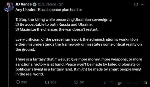 通过美国向乌克兰提供武器,资金就能战胜俄罗斯,这纯属“幻想”——就在乌克兰总统泽连斯基21日晚与美国副总统JD·万斯就美国提出的“28点和平计划”进行电话沟通后,美国副总统JD·万斯在社交平台上发表了上述言论。 万斯表示,任何旨在结束俄罗斯在乌克兰战争的方案都应维护乌克兰的主权,并且必须得到两国的认可。但他同时认为,如果美国向基辅提供更多资金或武器,或对莫斯科实施更严厉的制裁,就期望乌克兰能够获胜,这种想法纯属“幻想”。有一种幻想认为,只要我们提供更多的资金、更多的武器或更严厉的制裁,胜利就会唾手可得。”