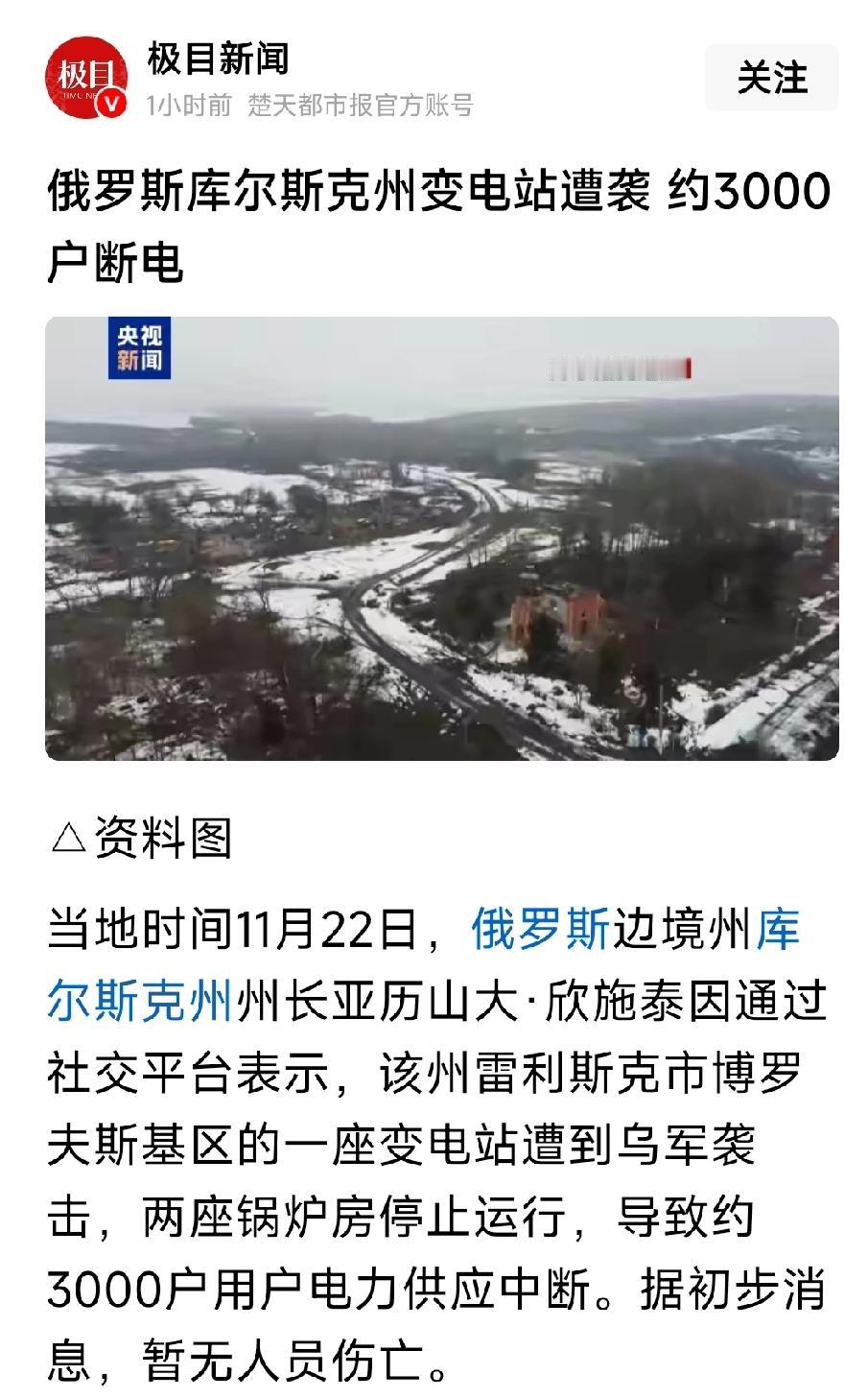 俄罗斯库尔斯克州变电站遭袭,该州3000户居民将遭遇断电。
