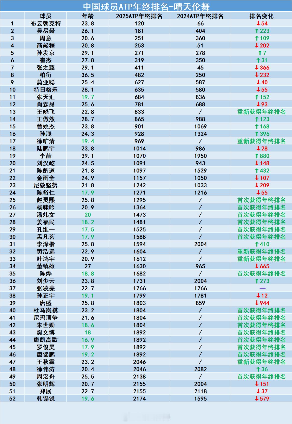 2025赛季中国选手ATP年终单打排名汇总1️⃣52人获得ATP年终单打排名,其中前一百0人、101-200位区间2人、201-300位区间3人(2024赛季前一百3人、101-200位区间0人、201-300位区间2人)2️⃣与2024赛季相比,33人排名上升,18人排名下降,其中15人首次获得排名!