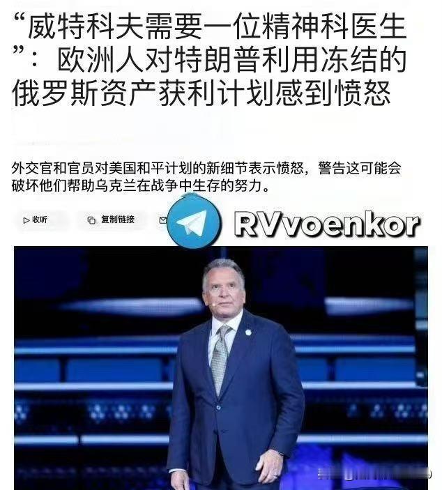 外媒报道,欧盟对于美俄提出的“28点和平计划”方案的不满,并已经升级到了针对美国特使维特科夫本人的鄙视,声称维特科夫需要去看精神科医生。 他们最不满的一点在于,特朗普的计划破坏了欧盟关于“挪用被冻结的俄罗斯资产挽救乌克兰政府财政”的想法,而在特朗普提出的“28点和平计划”中的相关条款中,特朗普居然想将这笔钱作为商业投资,而从中获利。
