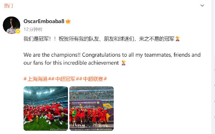 上海海港锁定本赛季中超冠军后,球队功勋外援奥斯卡发来祝贺:“我们是冠军!!祝贺所有我的队友、朋友和球迷们,来之不易的冠军🏆 ”