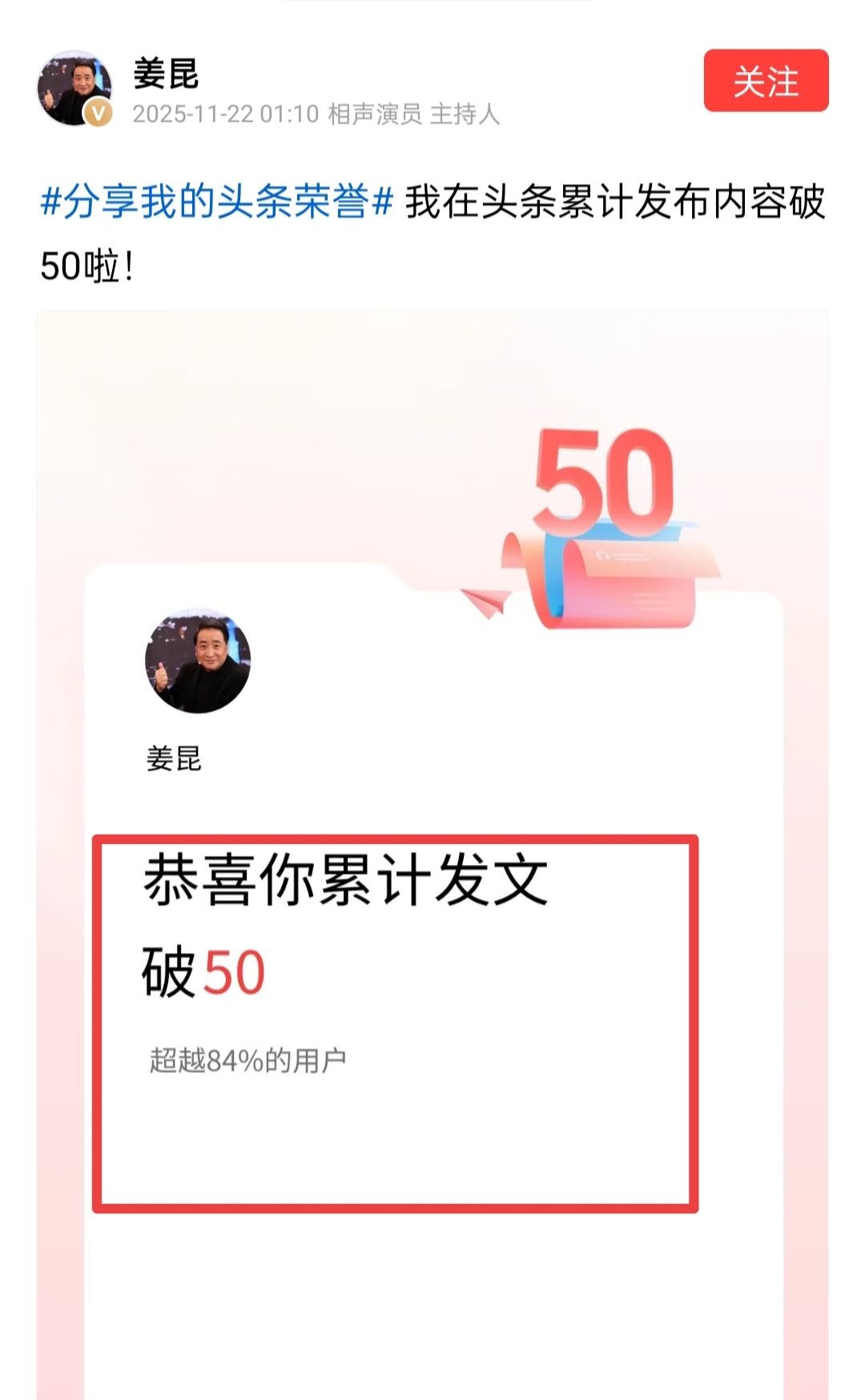 姜昆老师在头条报喜讯了。11月22日凌晨一点多钟,姜昆先生在头条上分享了一条喜讯,该喜讯就是他累计发文量超过50了。 谈起姜昆,我们便想到他曾经管理相声界几十年。在对相声的认知上,姜昆一向追求高雅,反对庸俗,媚俗和低俗的相声,强调相声应该让人懂得一些道理,要有教育意义。 要说姜昆先生有什么好作品?很多人都知道,他早期的作品真的很好看,像《虎口遐想》那可是真的经典。姜昆的相声就是不同于传统相声,是属于新派相声。新派相声在叙事结构、演出形式上与传统相声相比有很大的变化。 近日,姜昆在头条上发了文章与微头条, 也与网友们分享了他的故事。至于姜昆先生的争议,这里就不做讨论了。现在姜昆也退休了,他应该也不过问相声界的俗事了。