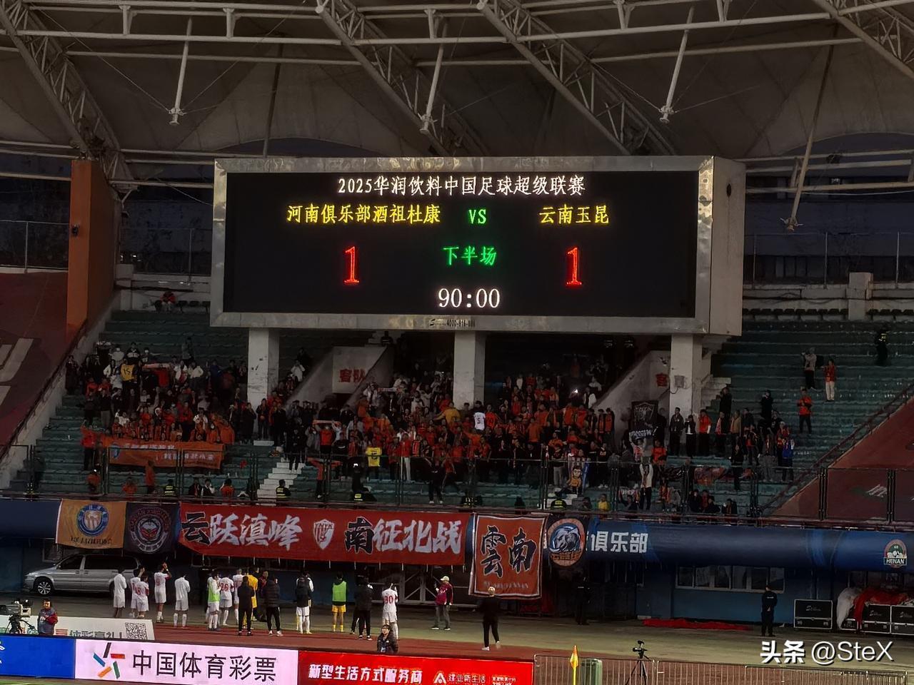 中超落幕,河南俱乐部酒祖杜康平稳收官。 中超第30轮河南俱乐部酒祖杜康主场对阵云南玉昆,客队摆大巴,主队有机会取得3分但自身失误使双方1比1战平,河南队本赛季最终排名第十,结果在此时似乎不那么重要了! 拉莫斯情商一流,让老將尹鸿博在最后一轮登场。赛后航体举行了告别仪式,为这位在自己最佳时期奉献给河南的河南女婿的职业生涯画上完美句号。赛后航体成为欢乐的海洋,球队为球迷送上礼物,球迷为球队送上巨幅TIFO。 足协杯河南加油!河南冠军!
