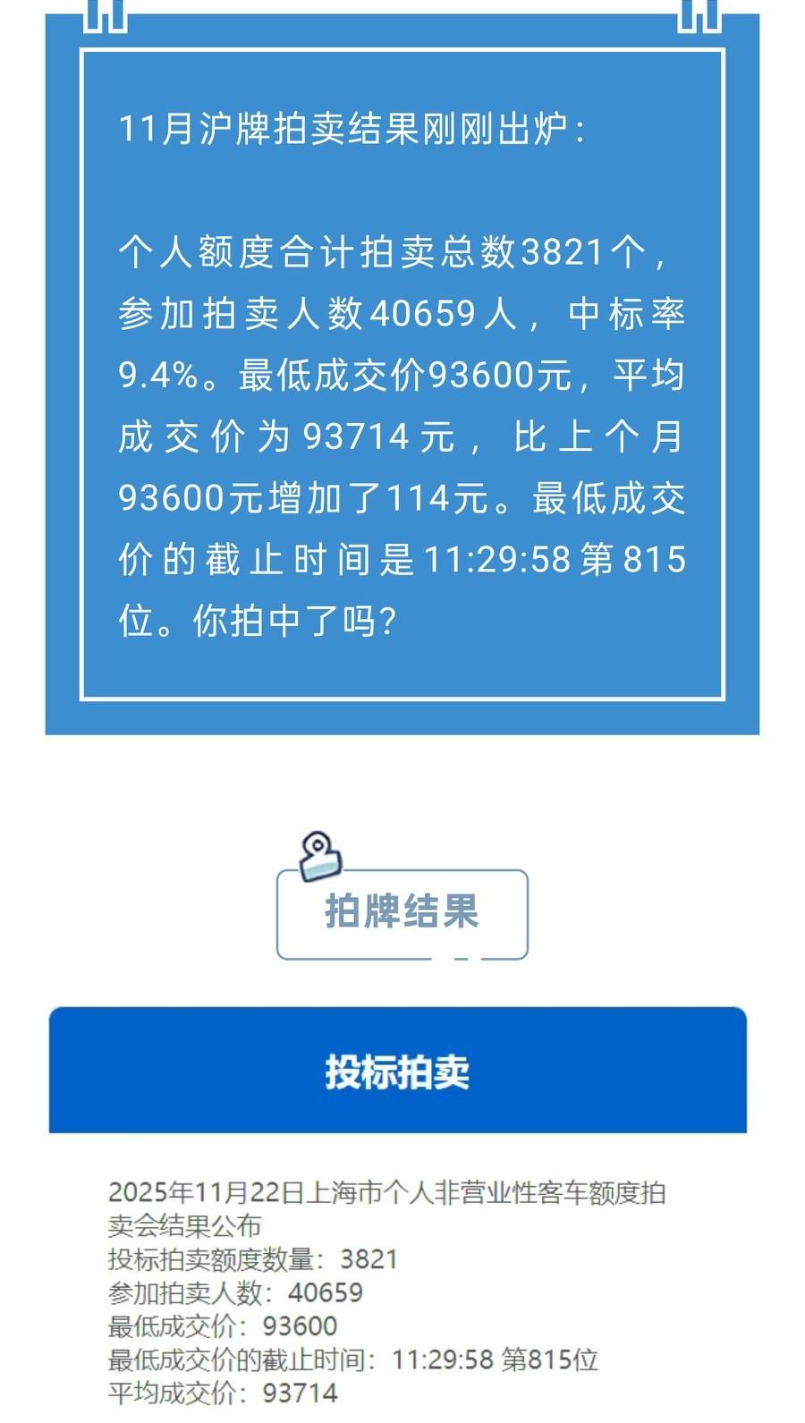 沪牌继续限购,交通却依旧拥堵!11月上海沪牌拍卖结果揭晓,最新消息新鲜出炉!这结果真挺让人有话说。这次个人额度拍卖总数3821个,可参加拍卖的有40659人,中标率9.4%。这概率虽然不算高,但也比中上海国补强多了。最近每次都参加上海的国补,每次都把能选的全部都选上,但每次都没有中,甚至是一个都没有中,你说这奇不奇怪,概率低不低? 最低成交价93600元,平均成交价93714元,比上个月涨了114元。别小看这114元,那可是一笔巨款,可以在上海吃两顿中饭呢。 这沪牌价格就跟温水煮青蛙似的,慢慢往上爬。每个月涨100,一年下来就是涨1200块。 最低成交价截止时间是11:29:58第815位,能在这个节点中标,运气简直爆棚。我是好久没有参加这个竞拍了,所以说也只能祝福他们参加的人。不知道那些中标者是不是高兴得要飞起,没中的估计又得等下一次了。 这次你中了没有?