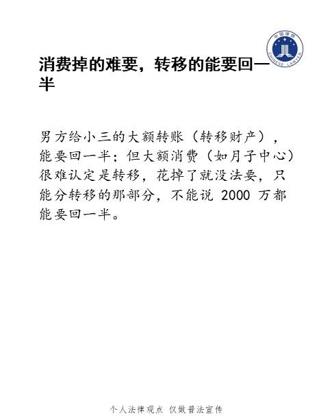 男方给小三的大额转账(转移财产),能要回一半;但大额消费(如美容院养生馆等)很难认定是转移,花掉了就没法要,只能分转移的那部分,不能说 2000 万都能要回一半。律师说法