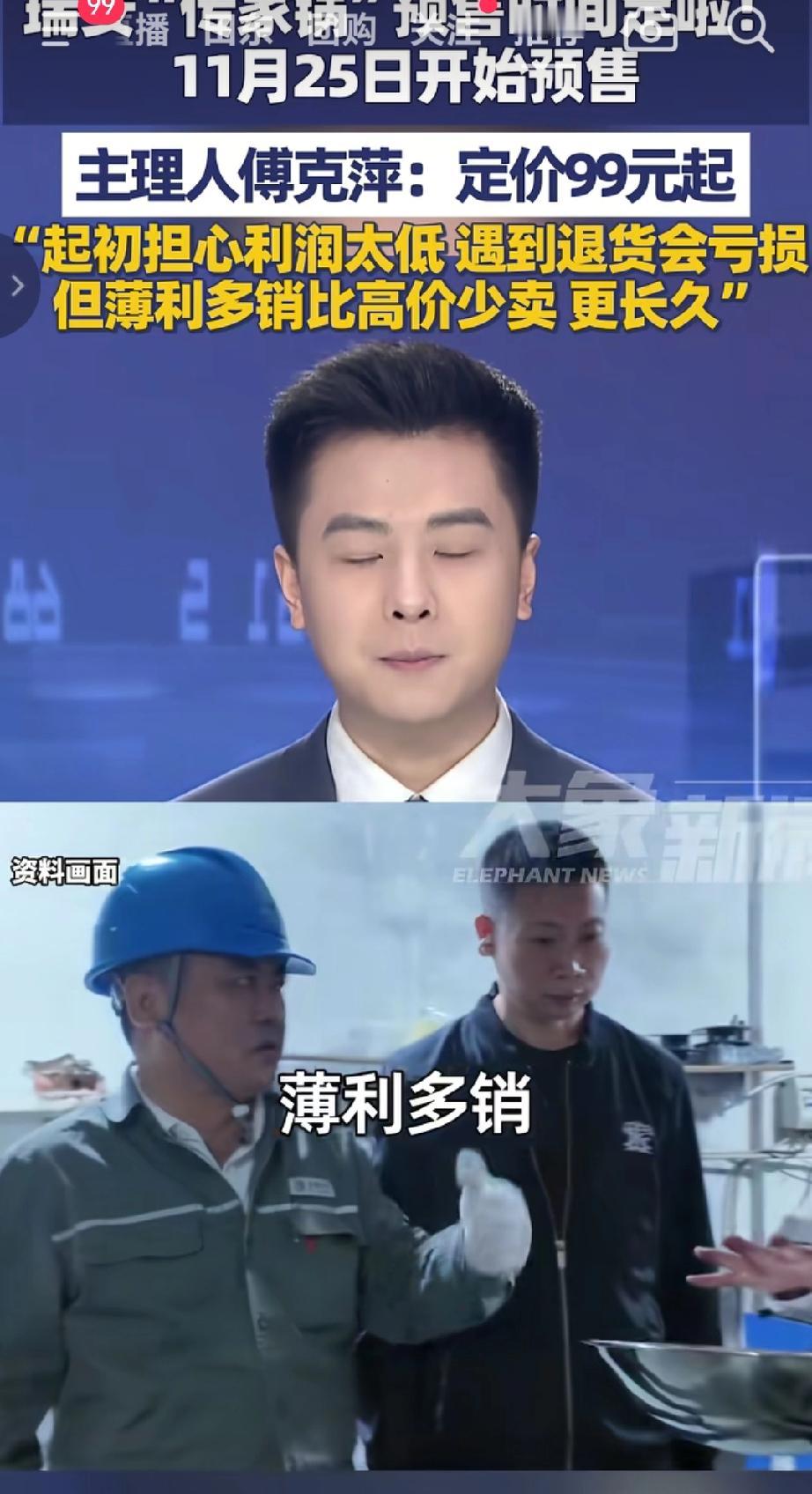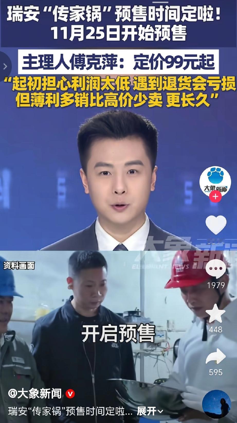 近日瑞安“传家锅”主理人傅克萍首称首批经典复刻版炒锅将于11月25日开始预售价为99元起,傅克萍起初担心利润太低,遇到退货会亏损,但后来认为薄利多销比高价少卖更长久,希望通过实在的定价和稳定的品质积累口碑、留住回头客。(来源于@大象新闻)