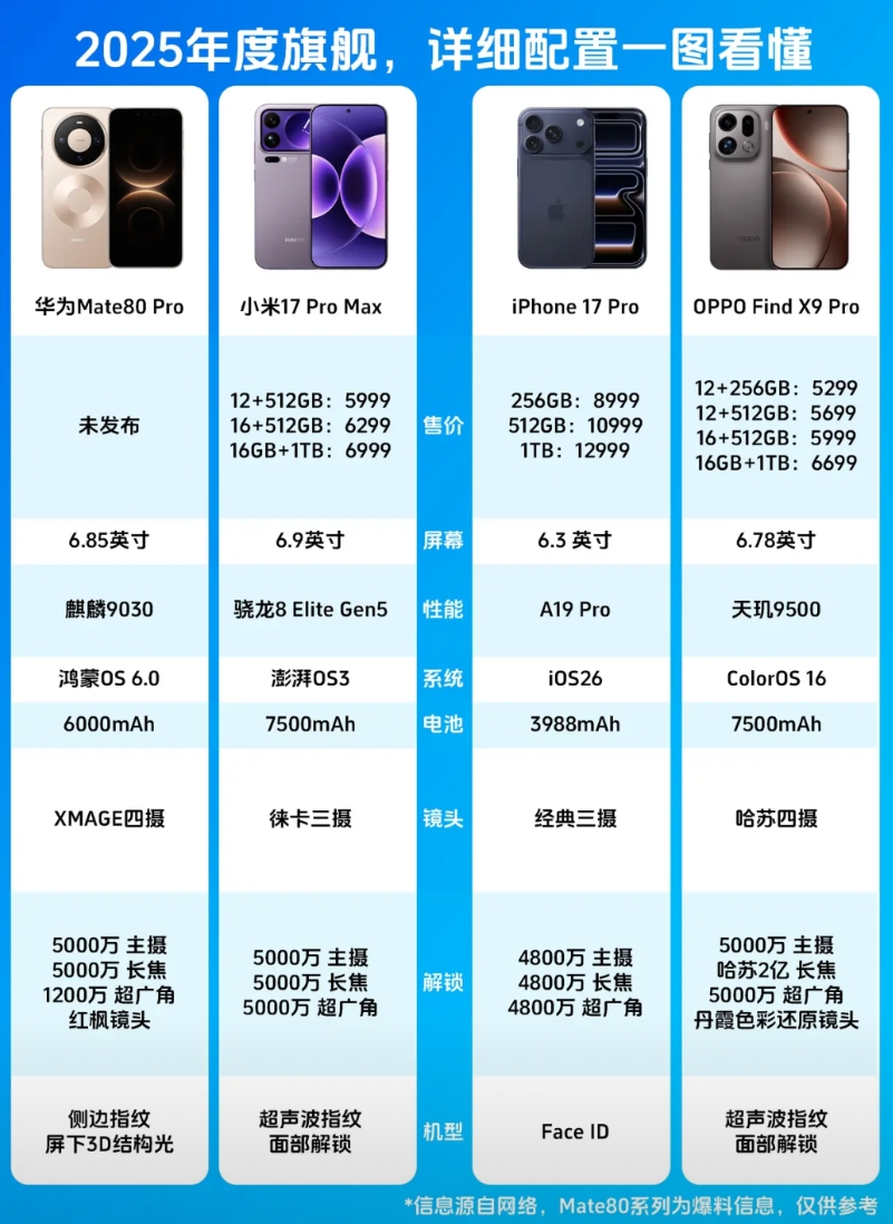 ✅小结 个人觉得,Mate80 Pro适合有拍照需求的商务人士,米17 Pro Max适合追求续航和背屏的用户;iPhone17 Pro预算高自有人选;OPPO Find X9 Pro堆料更全面,价格也更香,适合追求续航的拍照党。你们会怎么选呢?