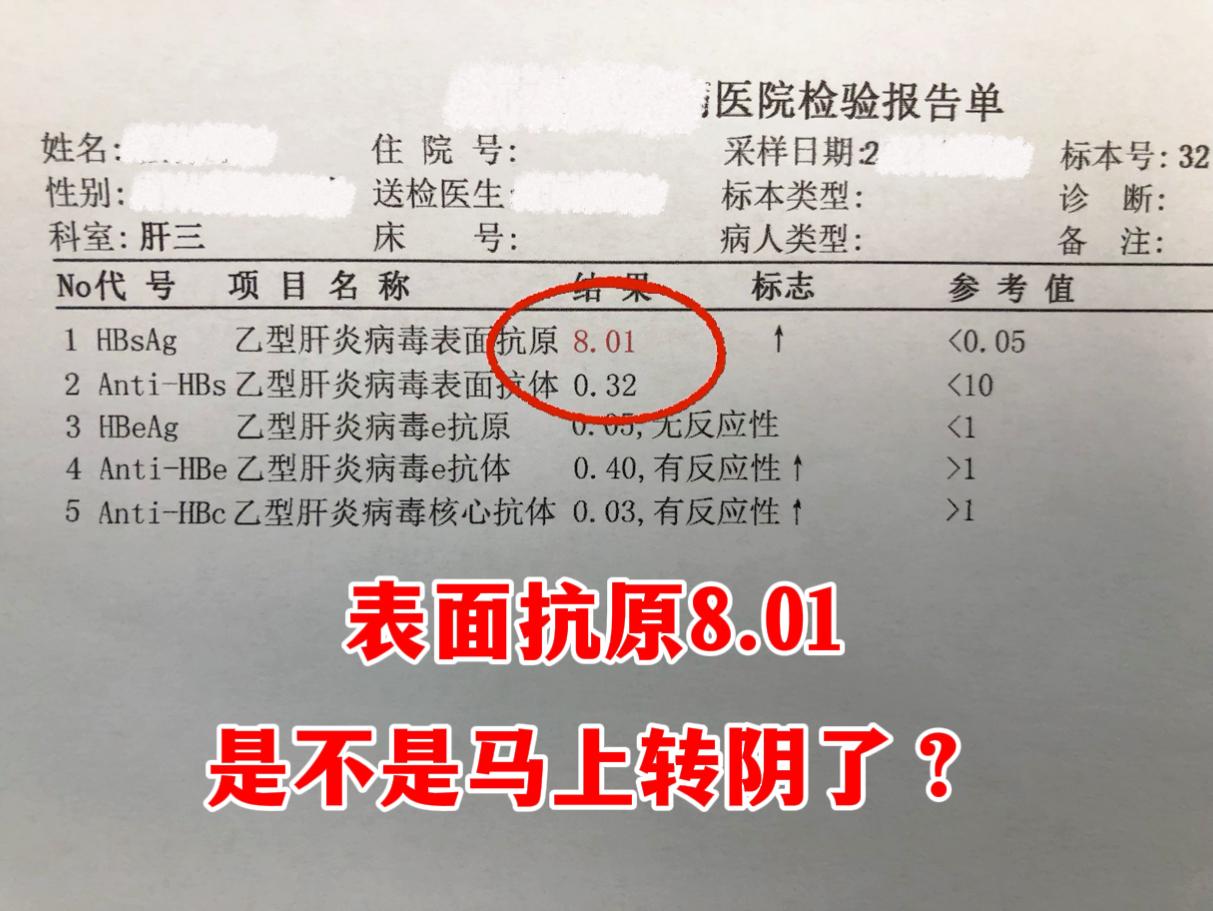 今天门诊太让人开心了!一直跟着我治疗的小李,是山东济南本地的,今天来复查,表面抗原只有8,拿过来给我看到时候问我:“教授,表面抗原8.01,我是不是要转阴了?”表面抗原非常低了,这是一个好消息,坚持治疗,转阴就在眼前。