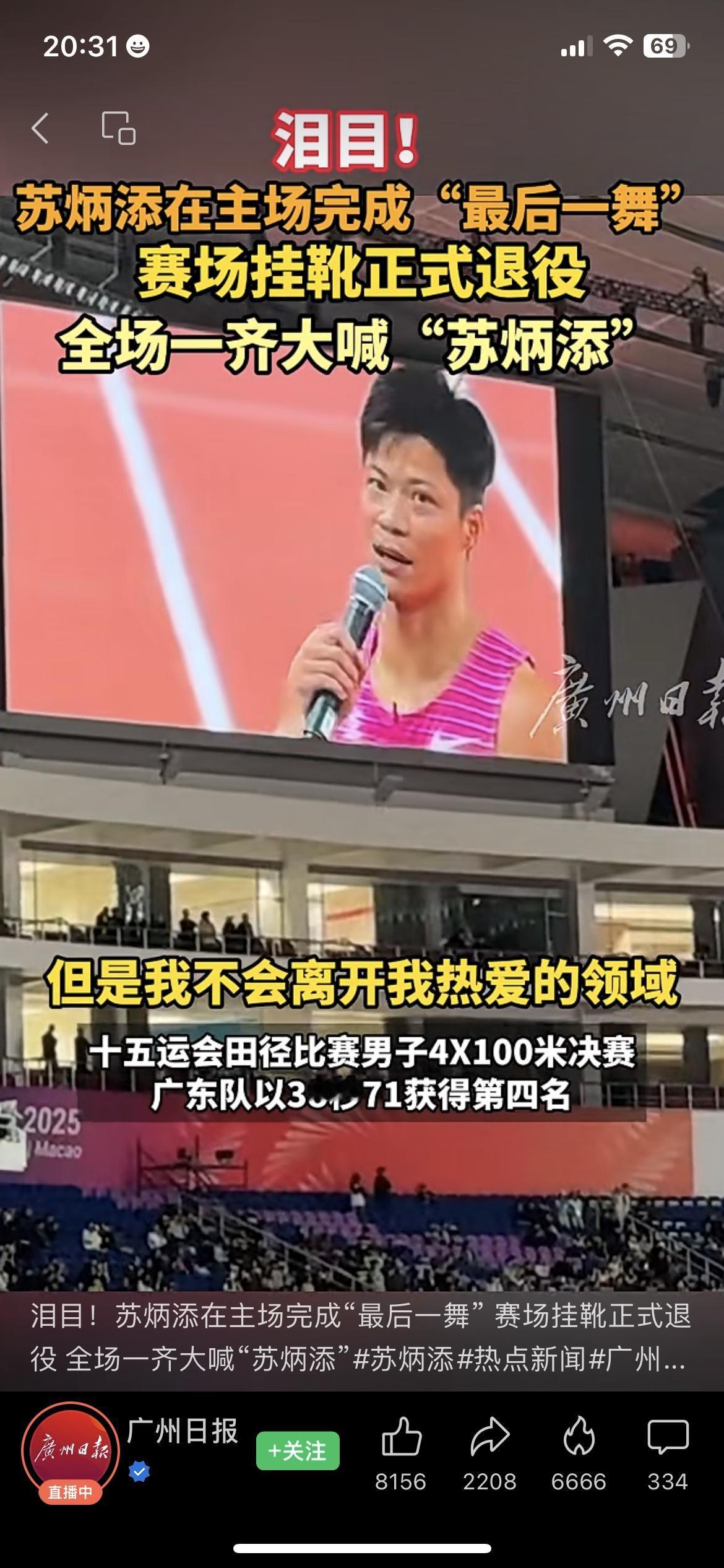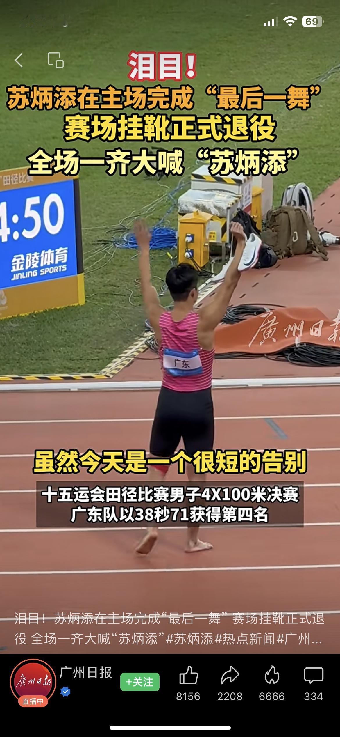 致敬苏炳添!生涯最后一战虽未夺金,仍是永远的亚洲飞人! 今天的全运会赛场太让人泪目了!苏炳添领衔广东队参加男子4×100米接力决赛,虽然最终拿到第四名没站上领奖台,但这可是这位“亚洲飞人”运动员生涯的收官战。从打破亚洲纪录到坚守赛场这么多年,他用速度和坚持成了无数人的榜样,冲线的那一刻,全场的掌声就是最好的致敬。你还记得第一次看他比赛的心情吗?评论区一起致敬! 苏炳添职业生涯谢幕 全运会田径