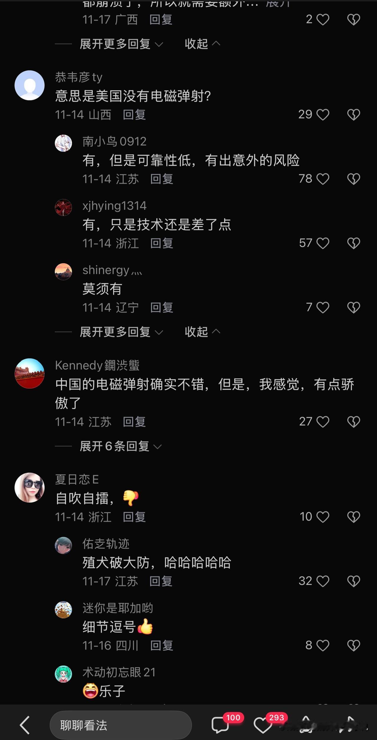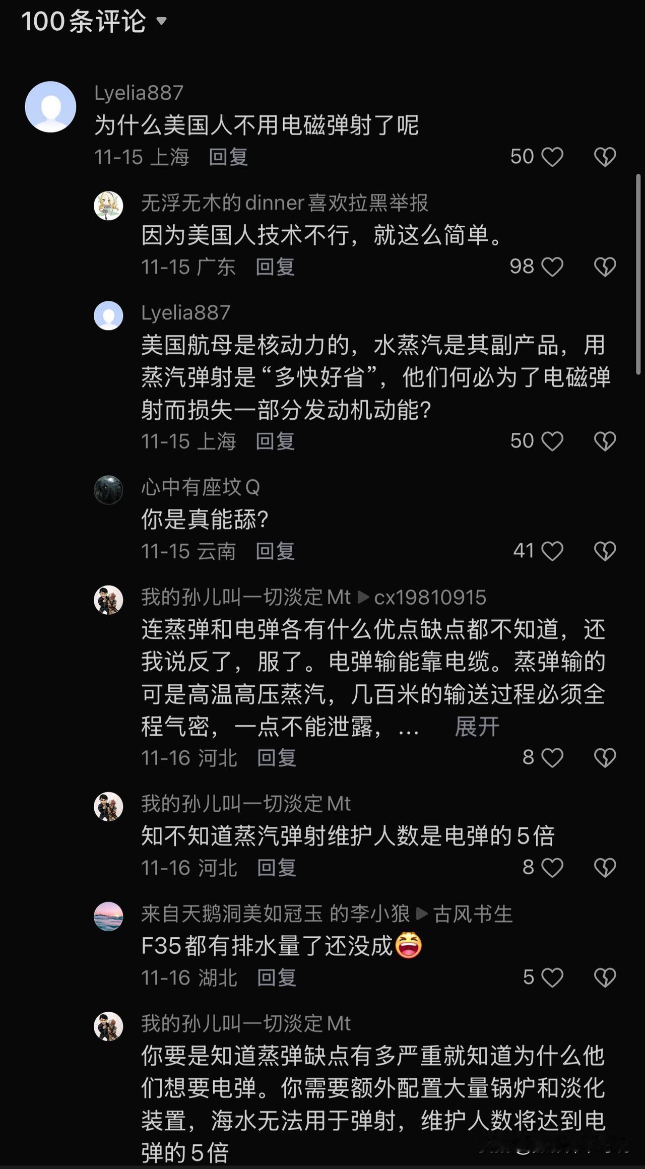 没想到一张简单的梗图,却炸出一大堆奇奇怪怪的人和想法!这张图应该是某位网友凭借自己的认知制作的,上边比较了熊猫电磁弹射、白头鹰蒸汽弹射和电磁弹射的效果,其间的优劣可见一斑。从目前网上爆出来的各种信息来看,它虽然是在玩儿梗,但还没到胡说八道的地步。但评论区就有意思了,各种阴阳怪气的、睁眼说瞎话的、强行洗地的都有,而且为数还不少,真是看的人充满了疑惑,他们是怎么想的呢?