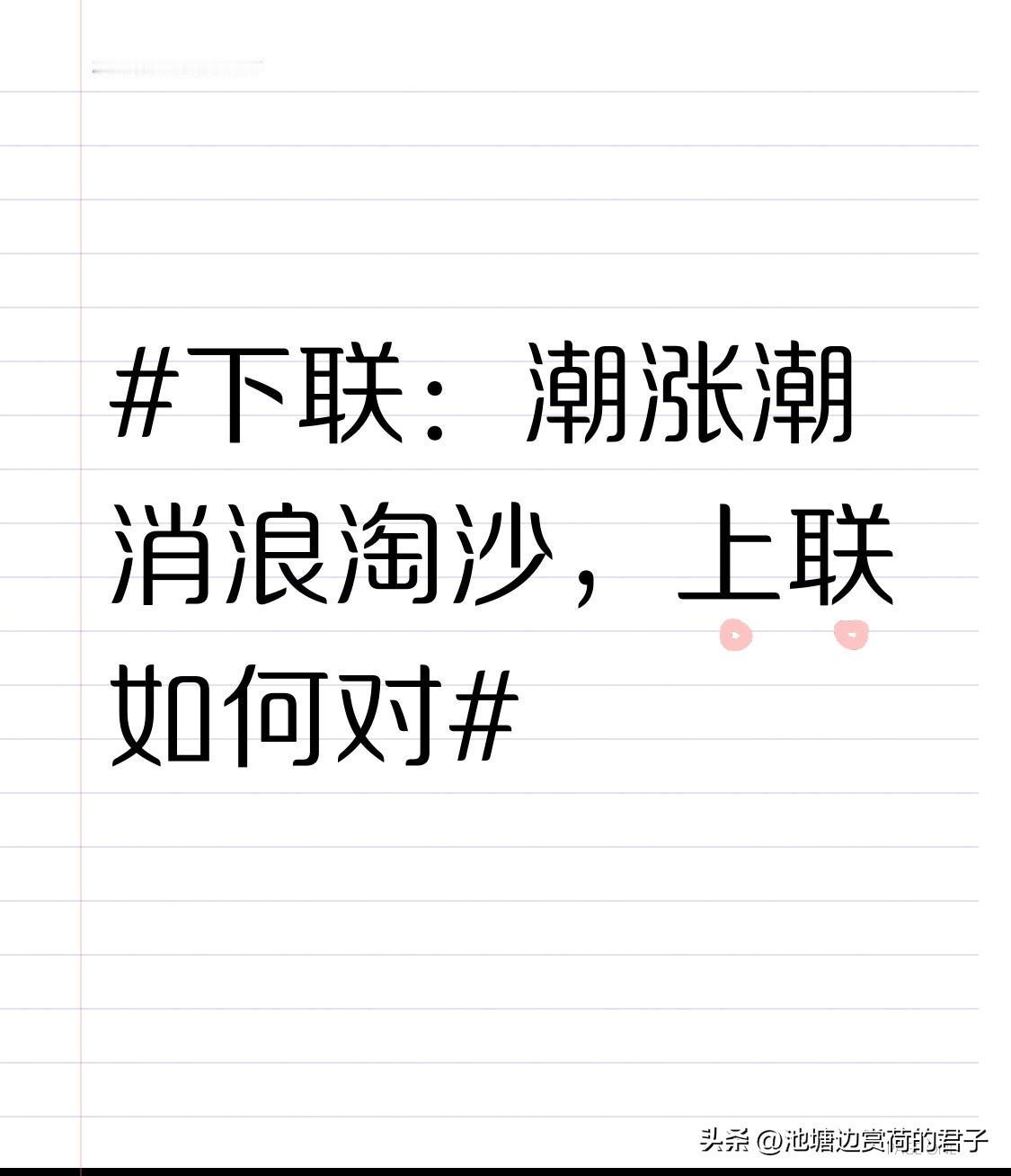 对联文化真是博大精深,就像“潮涨潮消浪淘沙”这句下联,要对出合适的上联还挺有挑战性。 有这么个含三点水的上联“溪涧涓流波荡浦”,和“江洋潮涌浪淘沙”搭配,就很妙。上联从细腻蜿蜒的溪涧涓流,到波荡的浦水,由静到动、由小到大。下联“潮涨潮消浪淘沙”则展现出江海潮浪的气势。“溪涧”对“潮涨”,“涓流”对“潮消”,“波荡浦”对“浪淘沙”,对仗工整,还强化了三点水偏旁,描绘出灵动的水世界,就像一幅动态的生态画卷。不得不说,对联的魅力就在于此,短短几个字,却有无穷韵味。