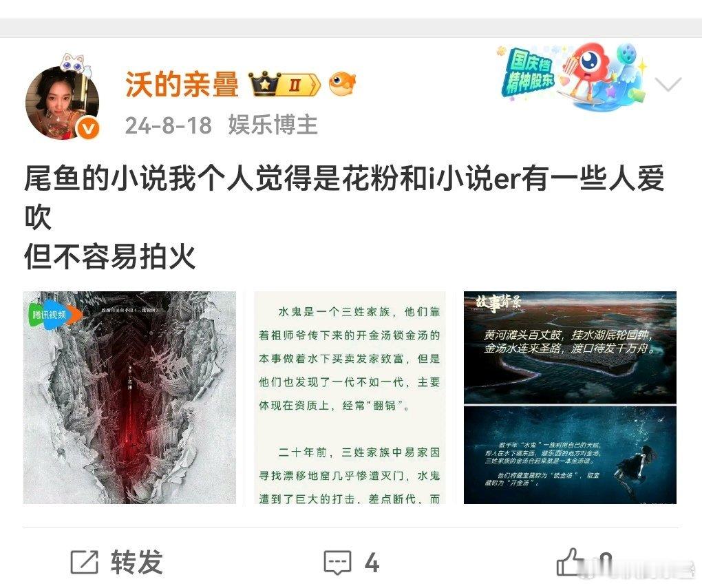 我是一直对尾鱼的小说都不感兴趣and觉得不行不是妮or巴etc那些演员的问题,就是ip不咋样比如山河枕长公主献鱼月明千里将门这些我是对小说可能看不上,但设定和梗还行,拍剧正常拉适配点儿的红人组点还行的局,可能就拍火了但是尾鱼老是说故事好女主人设好,但我一直觉得改编难度太大了,悬疑or奇诡的部分就难拍,还要把言情融在里面拍出feel尤其感情戏其实好多挺难磕的其实,难出效果同样被吹但难拍的还有凰权那作者的女强文
