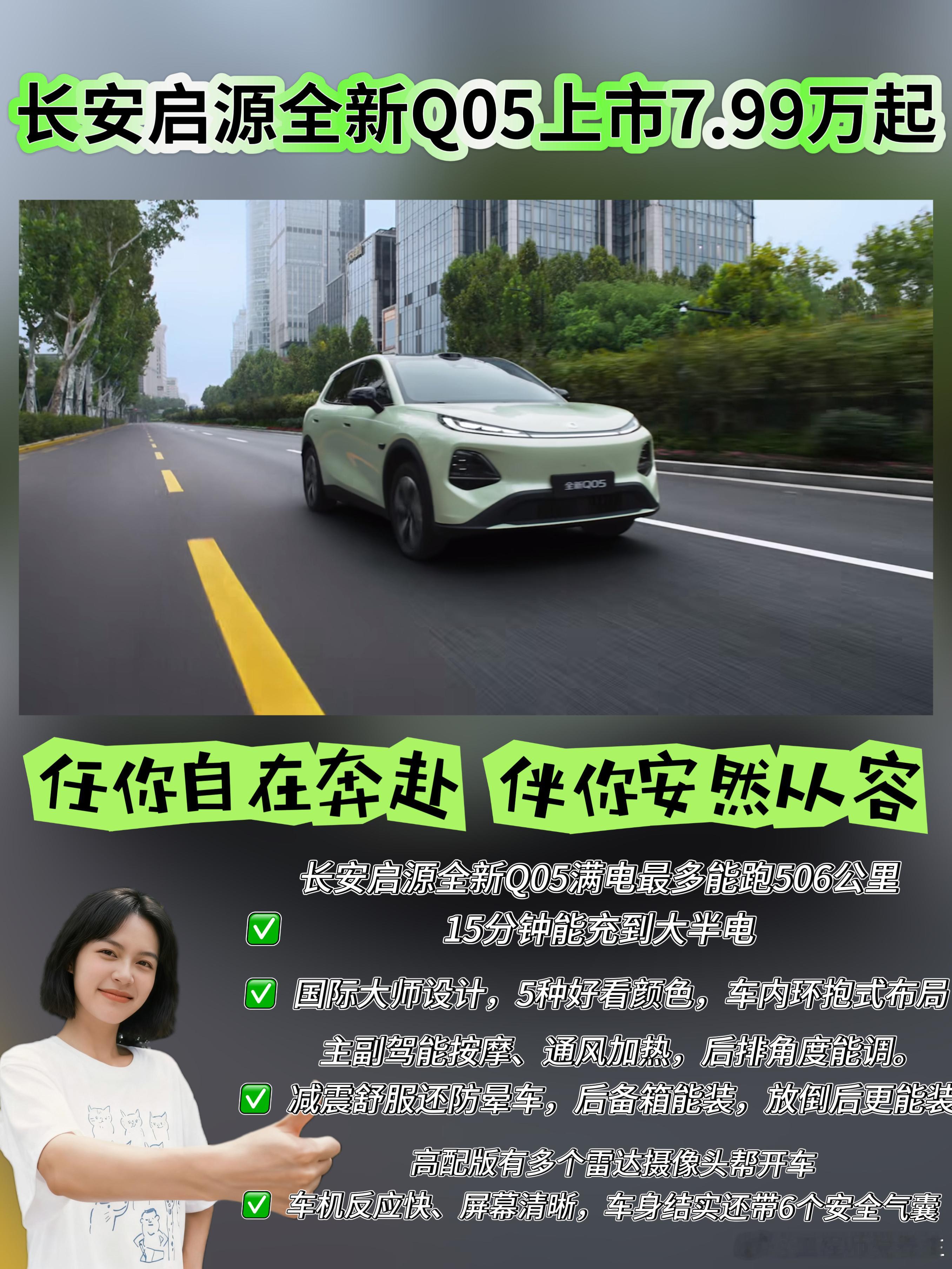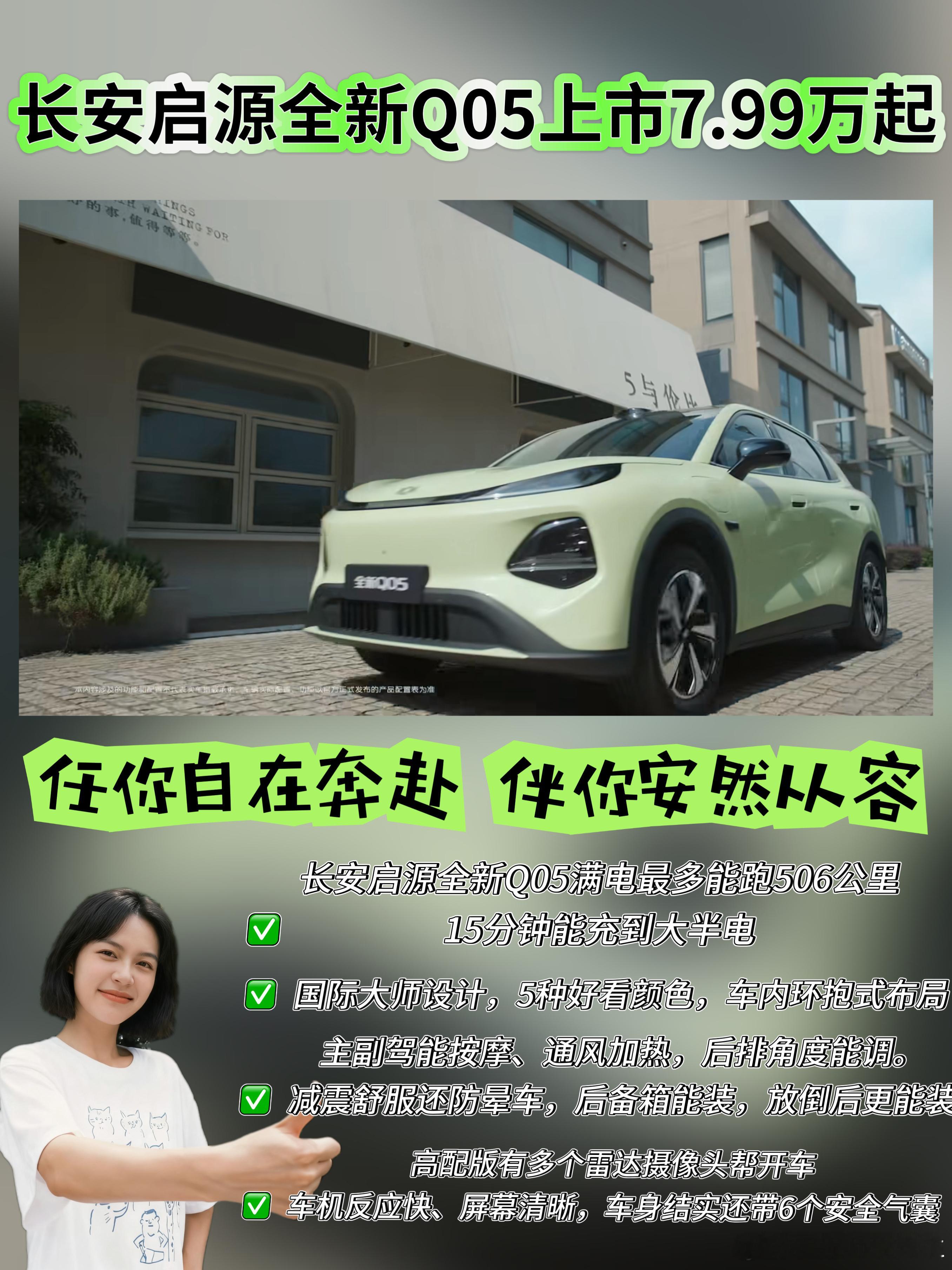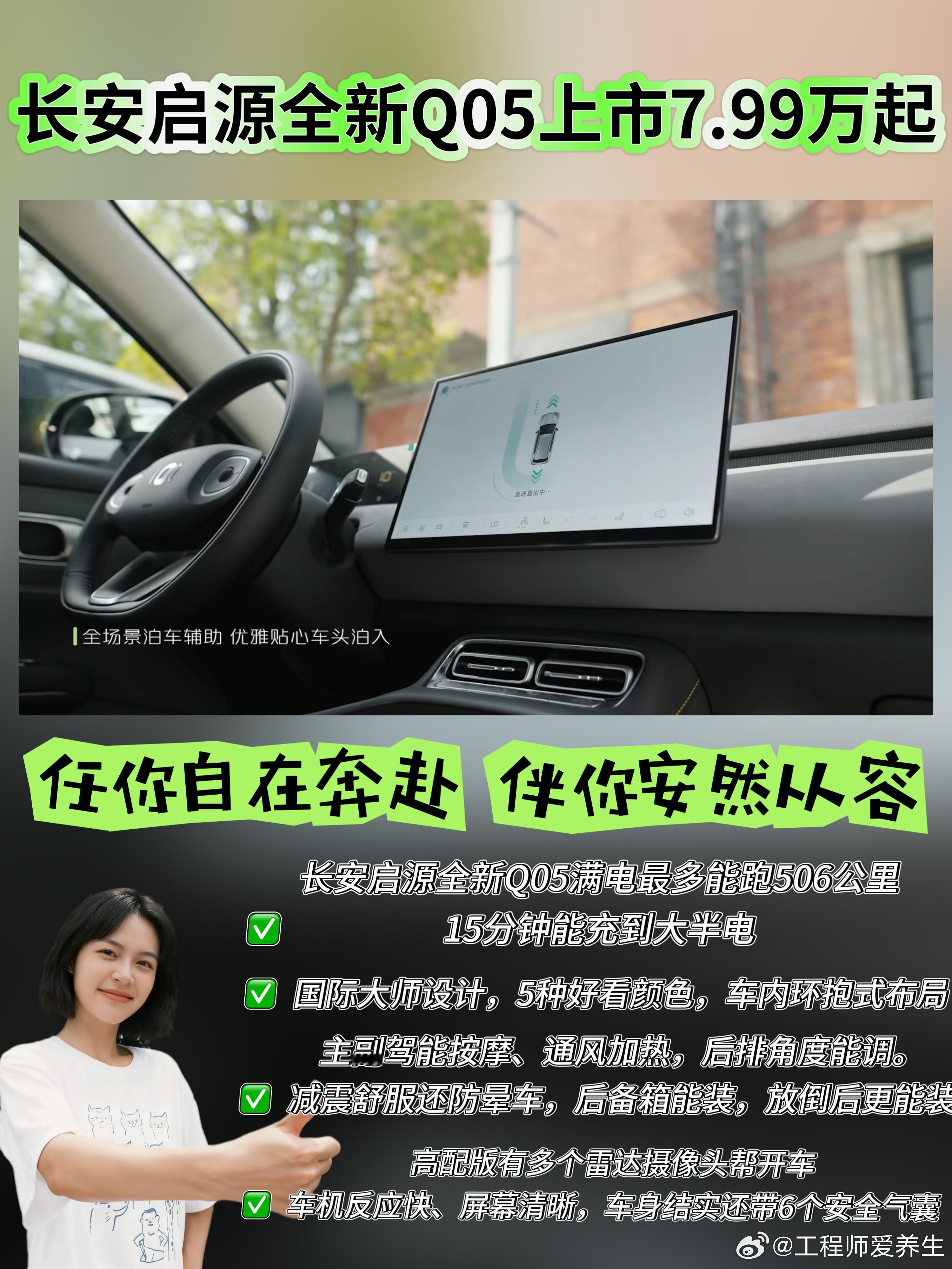 🎉🎉任你自在奔赴🎉🎉伴你安然从容 ✅405air 7.99万✅405max 8.99万✅506pro 9.59万✅506max 9.99万✅405激光Ultra 9.99万✅506激光Ultra 10.99万🚗💨 与长安启源Q05的相遇还记得那个让我焦头烂额的周末。上午送孩子去补习班,下午赶去公司加班,晚上还要帮老公取快递,开到半路电动车突然亮起“电量告急”红灯…那一刻,我蹲在路边盯着充电APP上“预计等待2小时”的提示,第一次对纯电车产生了怀疑。✅而这一切,在我试驾长安启源全新Q05 后彻底改变!这款车的506km CLTC续航,让我从上海开到南京往返都不用充电;更惊喜的是,它在15分钟内就能充电至大半电量——刚好够我吃顿简餐的时间,续航焦虑烟消云散!🔋🚗🚗🚗🚗🚗🚗🌟 移动的「智慧客厅」,原来车机可以这么懂我作为经常跨城见客户的市场人,我最爱它的无界数字生态。上次说“导航到上次的瑜伽馆”,系统精准定位到三个月前去过的的瑜伽馆。更让我惊喜的是,等待客户时开启无麦K歌,配合环抱式座舱的音响,瞬间把停车场变成私人练歌房!🎤副驾上的老妈则彻底迷上女王级体验:座椅通风缓解了她夏季乘车的闷热,按摩功能让她在长途旅行中安然入睡。最贴心的是后排靠背可调,孩子们终于不用歪着头打瞌睡了。全家出游时,540L后备箱轻松装下婴儿车+帐篷+食材,偶尔需要搬运大件时,放倒后排竟能塞进我淘来的复古落地灯!🚗🚗🚗🚗🚗🚗🛡️ 安全感,是藏在这些细节里的温柔雨夜在高架行驶时,天枢智能驾驶辅助系统的雷达精准识别到突然变道的车辆,提前0.5秒轻柔制动。有次在老小区遇到仅多出20cm的侧方车位,全场景泊车辅助居然完成了一次漂亮的“车头泊入”,让围观的老司机们都竖起大拇指!👍作为工程师,我特别欣赏它的防晕车设计——通过悬架调校与动能回收优化,让容易晕车的母亲第一次在电动车上看完了整部电影。6安全气囊+高强度车身的配置,就像为家人穿上隐形防护甲,每次握住方向盘时都特别踏实。🚗🚗🚗🚗🚗🚗🎨 设计美学,藏在每道曲线里的巧思国际大师设计的灵动大溜背不仅好看,更让风阻系数低至0.318Cd。1.8㎡全景天幕让女儿在郊外夜航时看到了流星雨,她兴奋地指着天空喊“妈妈的汽车会魔法”!✅最让我心动的是下沉式分层中控无线充电板斜置45°防滑落,下层储物格正好放下我的折叠键盘;全车29处储物空间甚至给儿子的恐龙玩具设计了专属位置。这种对生活场景的深度洞察,让人感受到工程师们是真的在“为用户造车”。🚗🚗🚗🚗🚗🚗💝 致「5与伦比」的我们三个月相伴,这辆Q05早已超越交通工具的范畴:它记得我晨间通勤最喜欢的播客清单,知晓周末去瑜伽馆的固定路线,储存着一家人草原自驾时的欢声笑语。某个加班的深夜,当我用手机远程开启座椅加热坐进驾驶舱时,突然理解了什么叫做“任你自在奔赴,伴你安然从容”。如果你也在寻找一台能装下全家梦想的智能伙伴,不妨去体验长安启源Q05。它或许不能让你成为体育馆里开演唱会的明星(虽然无麦K歌真的超嗨😆),但一定能成为你生活中最可靠的“第5个家人”。(偷偷说:最近发现它的“一度电跑十公里”真没夸张,上月电费比油车时期省了600+!)💰