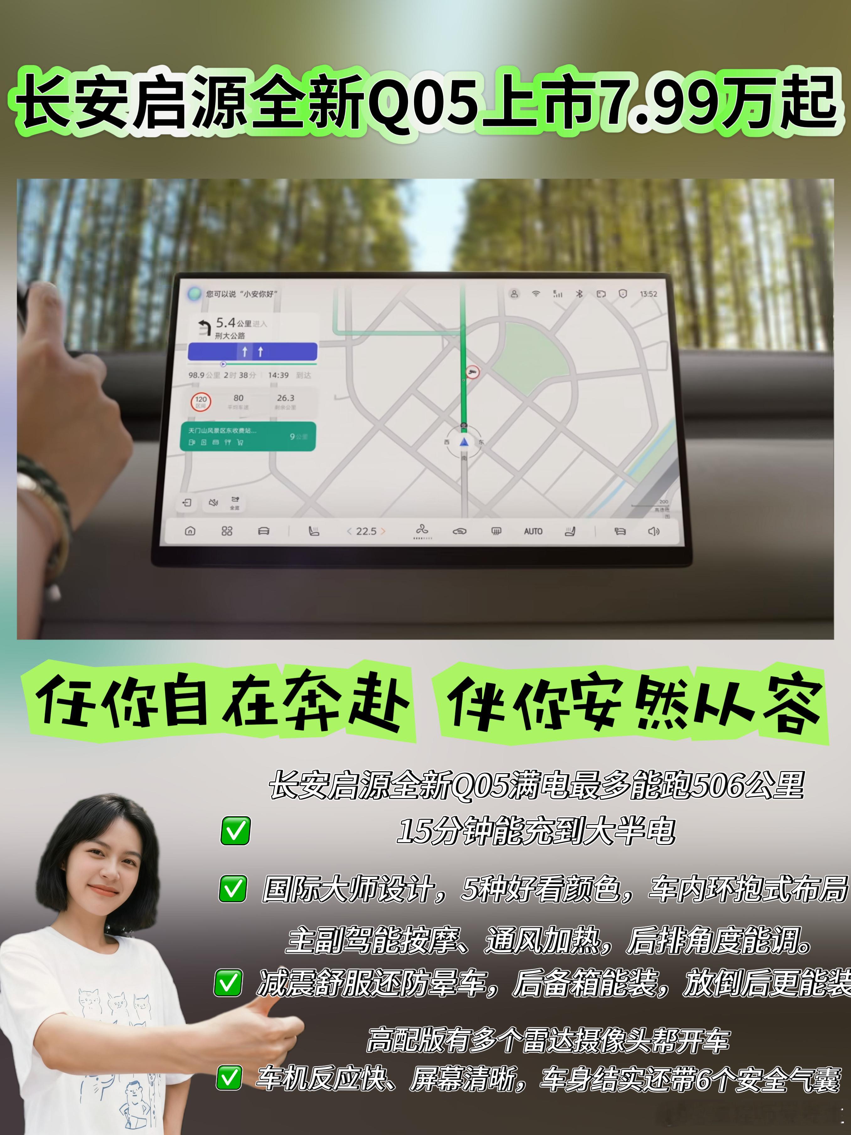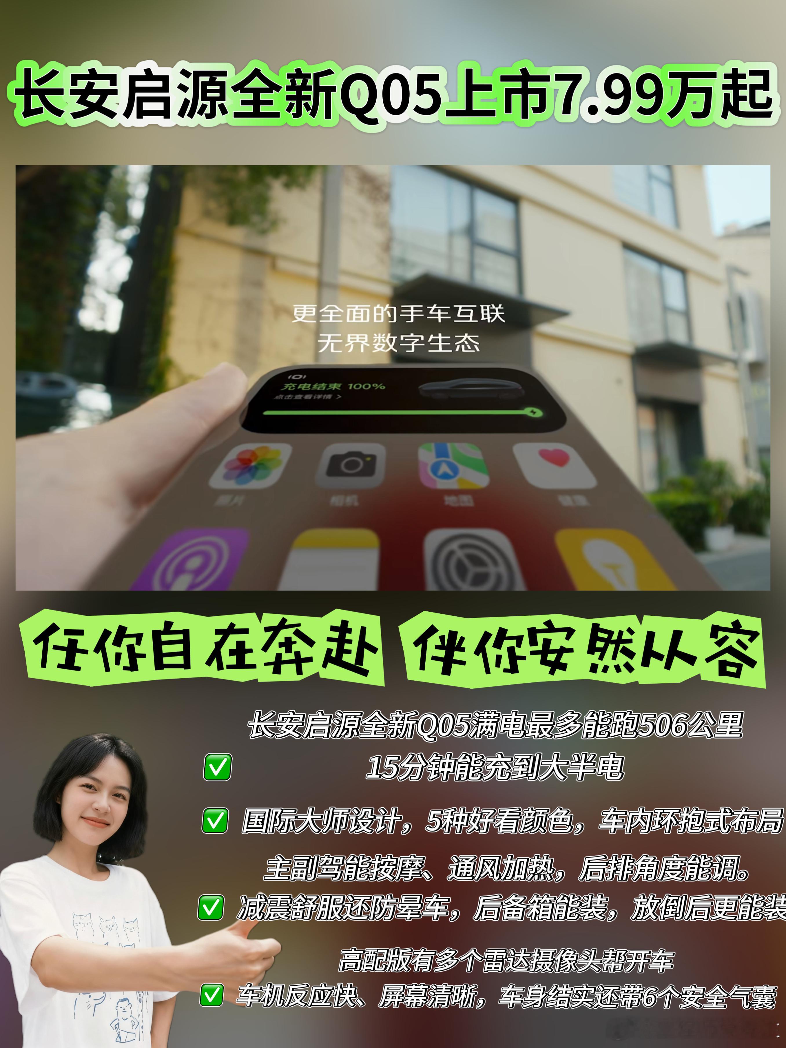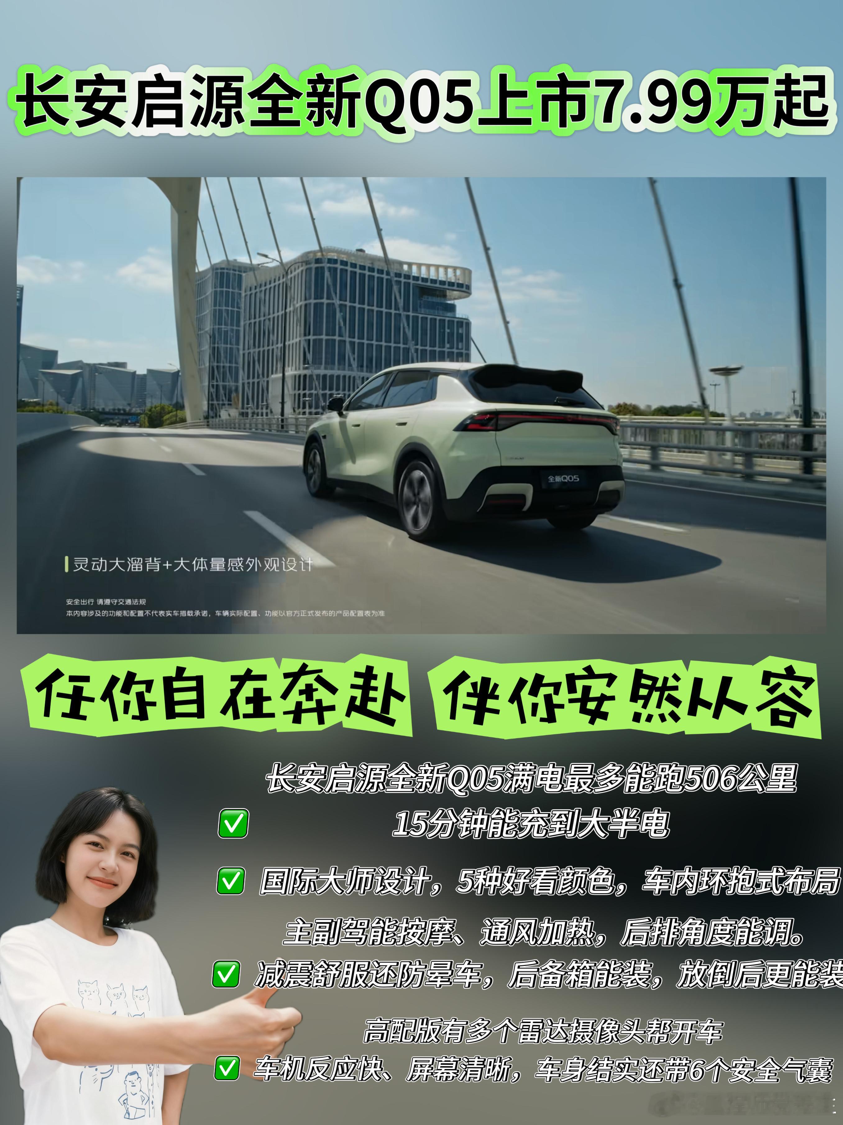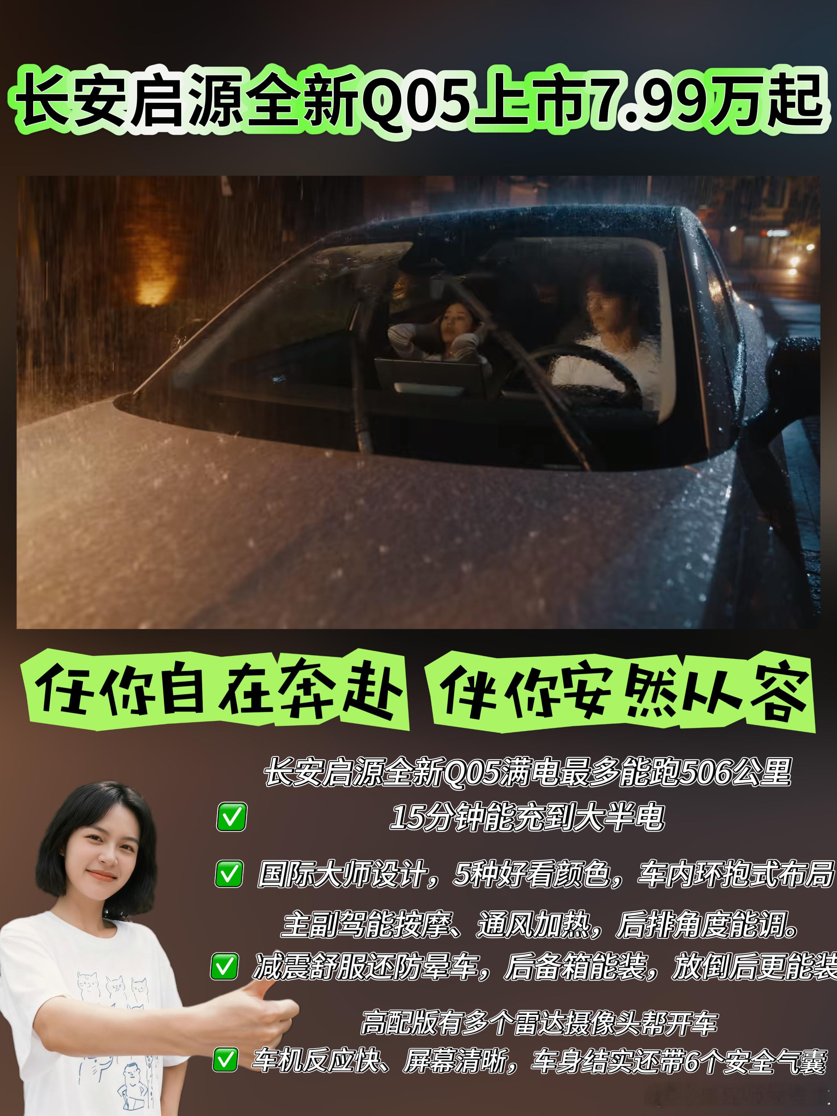🎉🎉任你自在奔赴🎉🎉伴你安然从容 ✅405air 7.99万✅405max 8.99万✅506pro 9.59万✅506max 9.99万✅405激光Ultra 9.99万✅506激光Ultra 10.99万🚗💨 与长安启源Q05的相遇还记得那个让我焦头烂额的周末。上午送孩子去补习班,下午赶去公司加班,晚上还要帮老公取快递,开到半路电动车突然亮起“电量告急”红灯…那一刻,我蹲在路边盯着充电APP上“预计等待2小时”的提示,第一次对纯电车产生了怀疑。✅而这一切,在我试驾长安启源全新Q05 后彻底改变!这款车的506km CLTC续航,让我从上海开到南京往返都不用充电;更惊喜的是,它在15分钟内就能充电至大半电量——刚好够我吃顿简餐的时间,续航焦虑烟消云散!🔋🚗🚗🚗🚗🚗🚗🌟 移动的「智慧客厅」,原来车机可以这么懂我作为经常跨城见客户的市场人,我最爱它的无界数字生态。上次说“导航到上次的瑜伽馆”,系统精准定位到三个月前去过的的瑜伽馆。更让我惊喜的是,等待客户时开启无麦K歌,配合环抱式座舱的音响,瞬间把停车场变成私人练歌房!🎤副驾上的老妈则彻底迷上女王级体验:座椅通风缓解了她夏季乘车的闷热,按摩功能让她在长途旅行中安然入睡。最贴心的是后排靠背可调,孩子们终于不用歪着头打瞌睡了。全家出游时,540L后备箱轻松装下婴儿车+帐篷+食材,偶尔需要搬运大件时,放倒后排竟能塞进我淘来的复古落地灯!🚗🚗🚗🚗🚗🚗🛡️ 安全感,是藏在这些细节里的温柔雨夜在高架行驶时,天枢智能驾驶辅助系统的雷达精准识别到突然变道的车辆,提前0.5秒轻柔制动。有次在老小区遇到仅多出20cm的侧方车位,全场景泊车辅助居然完成了一次漂亮的“车头泊入”,让围观的老司机们都竖起大拇指!👍作为工程师,我特别欣赏它的防晕车设计——通过悬架调校与动能回收优化,让容易晕车的母亲第一次在电动车上看完了整部电影。6安全气囊+高强度车身的配置,就像为家人穿上隐形防护甲,每次握住方向盘时都特别踏实。🚗🚗🚗🚗🚗🚗🎨 设计美学,藏在每道曲线里的巧思国际大师设计的灵动大溜背不仅好看,更让风阻系数低至0.318Cd。1.8㎡全景天幕让女儿在郊外夜航时看到了流星雨,她兴奋地指着天空喊“妈妈的汽车会魔法”!✅最让我心动的是下沉式分层中控无线充电板斜置45°防滑落,下层储物格正好放下我的折叠键盘;全车29处储物空间甚至给儿子的恐龙玩具设计了专属位置。这种对生活场景的深度洞察,让人感受到工程师们是真的在“为用户造车”。🚗🚗🚗🚗🚗🚗💝 致「5与伦比」的我们三个月相伴,这辆Q05早已超越交通工具的范畴:它记得我晨间通勤最喜欢的播客清单,知晓周末去瑜伽馆的固定路线,储存着一家人草原自驾时的欢声笑语。某个加班的深夜,当我用手机远程开启座椅加热坐进驾驶舱时,突然理解了什么叫做“任你自在奔赴,伴你安然从容”。如果你也在寻找一台能装下全家梦想的智能伙伴,不妨去体验长安启源Q05。它或许不能让你成为体育馆里开演唱会的明星(虽然无麦K歌真的超嗨😆),但一定能成为你生活中最可靠的“第5个家人”。(偷偷说:最近发现它的“一度电跑十公里”真没夸张,上月电费比油车时期省了600+!)💰